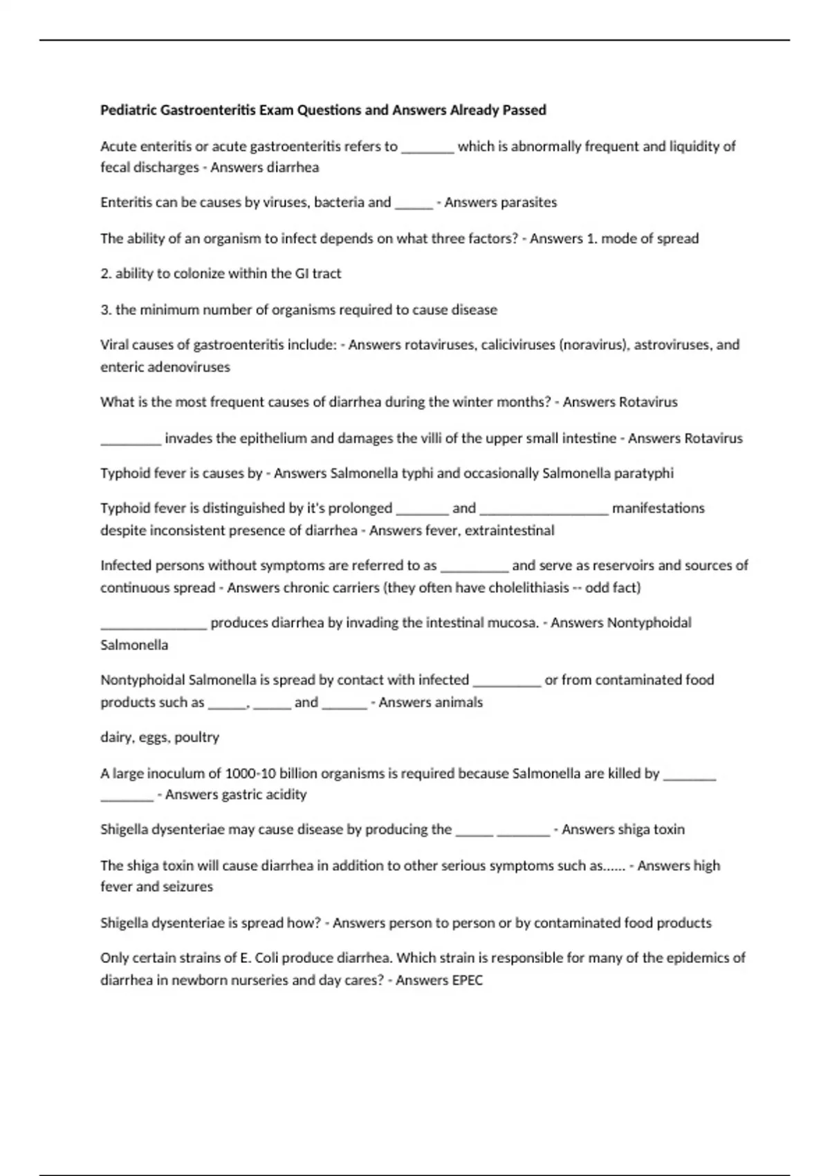 Pediatric Gastroenteritis Exam Questions and Answers Already Passed