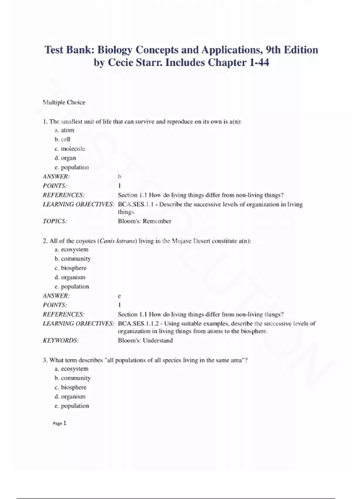 Test Bank - for Biology: Concepts and Applications 9th Edition by Cecie Starr, Christine Evers, Lisa Starr, All Chapters 1-44 |Complete Guide A+