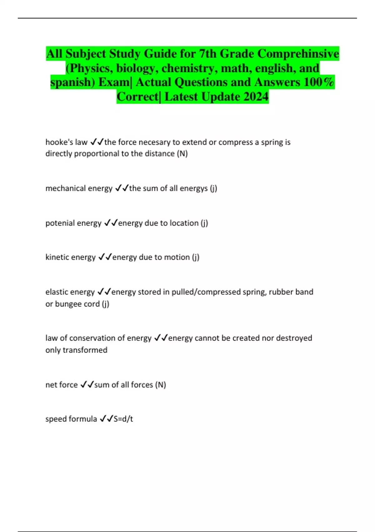All Subject Study Guide for 7th Grade Comprehinsive (Physics, biology, chemistry, math, english, and spanish) Exam| Actual Questions and Answers 100% Correct| Latest Update 202