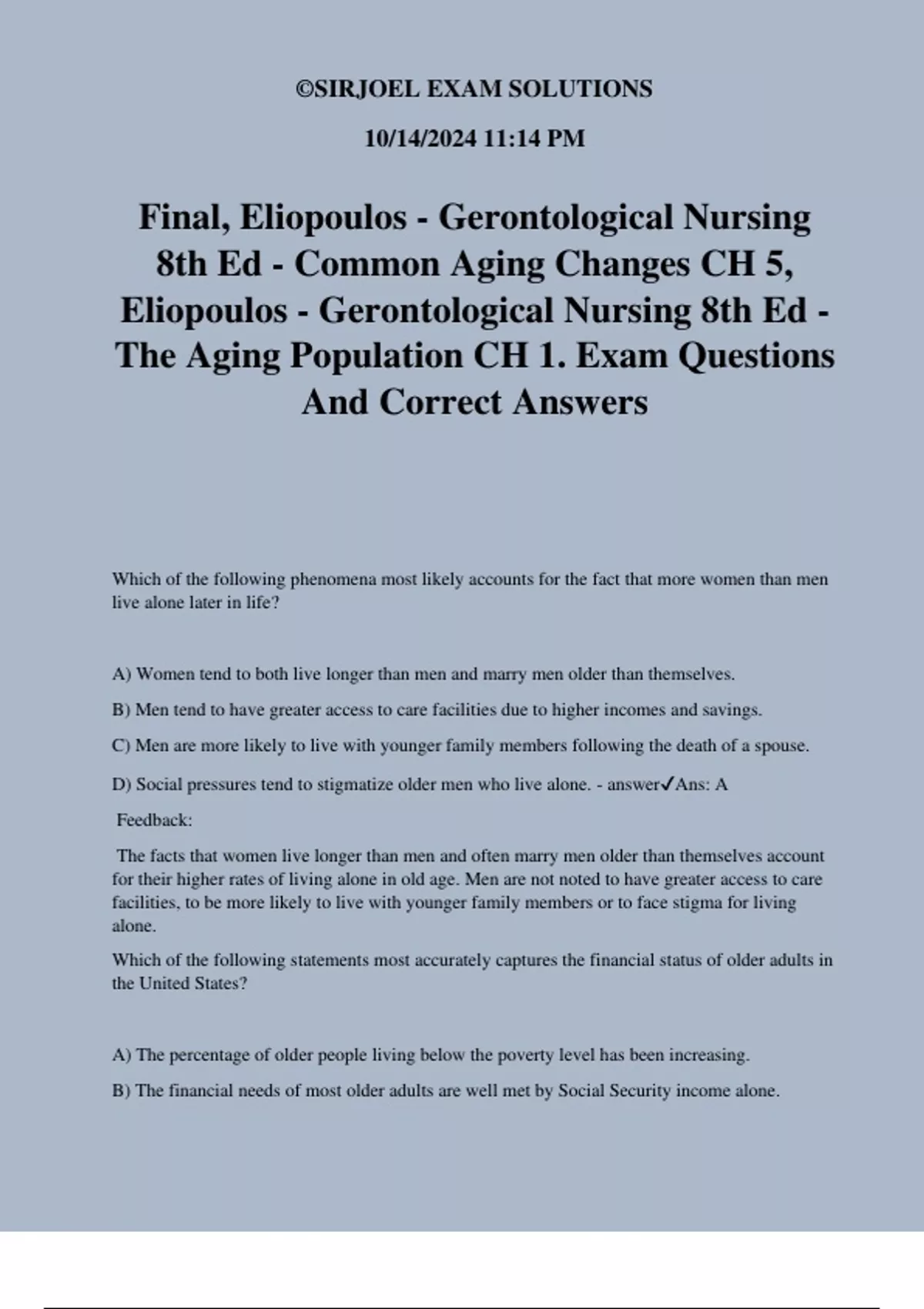Final, Eliopoulos - Gerontological Nursing 8th Ed - Common Aging Changes CH 5, Eliopoulos - Gerontological Nursing 8th Ed - The Aging Population CH 1. Exam Questions And Correct Answers Which of the following phenomena most likely accounts for the fact that more women than men live alone later in life? A) Women tend to both live longer than men and marry men older than themselves. B) Men tend to have greater access to care facilities due to higher incomes and savings. C) Men are more likely to live with younger family members following the death of a spouse. D) Social pressures tend to stigmatize older men who live alone. - answerAns: A Feedback: The facts that women live longer than men and often marry men older than themselves account for their higher rates of living alone in old age. Men are not noted to have greater access to care facilities, to be more likely to live with younger family members or to face stigma for living alone. Which of the following statements most accurately captures the financial status of older adults in the United States? A) The percentage of older people living below the poverty level has been increasing. B) The financial needs of most older adults are well met by Social Security income alone. ©SIRJOEL EXAM SOLUTIONS 10/14/2024 11:14 PM C) The recent decline in housing prices has made many older adults "asset rich and cash poor." D) Women 65 years of age and older is the fastest growing group of employment. - answerAns: C Feedback: The percentage of older people living below the poverty level has been declining, with about 10% now falling into this category. Most older people depend on Social Security for more than half of their income. Although the median net worth of older households is nearly twice the national average because of the high prevalence of home ownership by elders, many older adults are "asset rich and cash poor." The recent decline in housing prices, however, has made that asset a less valuable one for many older adults. There has been a significant rise in the percentage of middle-aged women who are employed, although there has been little change in the labor force participation of women 65 years of age and older. A care aide employed on a geriatric medicine unit of a hospital expresses frustration that "old people get sick so much more often than young people." What is the nurse's most appropriate response to this statement? A) "In fact, the prevalence of obesity and accompanying chronic illnesses mean that young people actually have more chronic conditions than older adults." B) "It's actually a myth that older adults require more hospitalization than young people." C) "Actually, older adults experience fewer acute illnesses than younger people, it's just that they tend to take longer to recover from them." D) "With the increase in life expectancies in recent years, most older people actually live free of chronic diseases until very late in life." - answerAns: C Feedback: The incidence of acute illness is lower among older adults than younger adults, though recovery times tend to be longer. Older adults tend to have a higher incidence of chronic illness and require more frequent and longer hospitalizations. Which of following statements most accurately captures the role of chronic illness in the lives of older adults? A) Chronic illnesses constitute the leading cause of death for older adults. B) More older adults die from acute illnesses than from chronic diseases. ©SIRJOEL EXAM SOLUTIONS 10/14/2024 11:14 PM C) While chronic diseases used to be the leading cause of death, this is no longer the case. D) While cancer rates have fallen, other chronic diseases remain a common cause of death. - answerAns: A Feedback: Chronic illnesses constitute the leading cause of death for older adults, exceeding those attributed to acute illnesses. The presence of heart disease as a cause of death has decreased in recent years, while at the same time cancer has become more prevalent. The board of a large chain of hospitals has commissioned a strategic plan in order to meet the care needs of baby boomers in coming years. Which of the following trends constitute a sound basis for understanding the baby boomer generation and conducting future planning? Select all that apply. A) Baby boomers tend to have fewer children than members of earlier generations. B) Adjusted for inflation, baby boomers have lower incomes than their parents had. C) Due to technology, baby boomers have more leisure time than other adults. D) Baby boomers perform physical exercise more frequently than other adults. - answerAns: A, D Feedback: Baby boomers have had fewer children than generations that preceded them and they tend to exercise more often. Their incomes tend to be higher while they enjoy less leisure time. The family of an 85-year-old man who has been admitted to hospital with exacerbation of his chronic obstructive pulmonary disease (COPD) has expressed concern about their ability to pay for his present and future care. Which of the following statements most accurately conveys the reality of payment for care services by older adults? A) The high value of assets owned by older adults makes the financial burden of care minimal for most older adults. B) Payment for long-term care of adults is most often covered by private insurers. C) Most older adults have their basic care needs provided in a long-term facility. D) Overall, federal money pays for more care than do older adults themselves or private insurers. - answerAns: D ©SIRJOEL EXAM SOLUTIONS 10/14/2024 11:14 PM Feedback: Most money for the care of older adults comes from federally funded programs. The burden of payment is still significant for most older adults and a minority of older adults receive care in an institutional living environment. Which of the following statements by the daughter of an 87-year-old resident of a nursing home would the nurse most likely want to correct or clarify? A) "It seems like more and