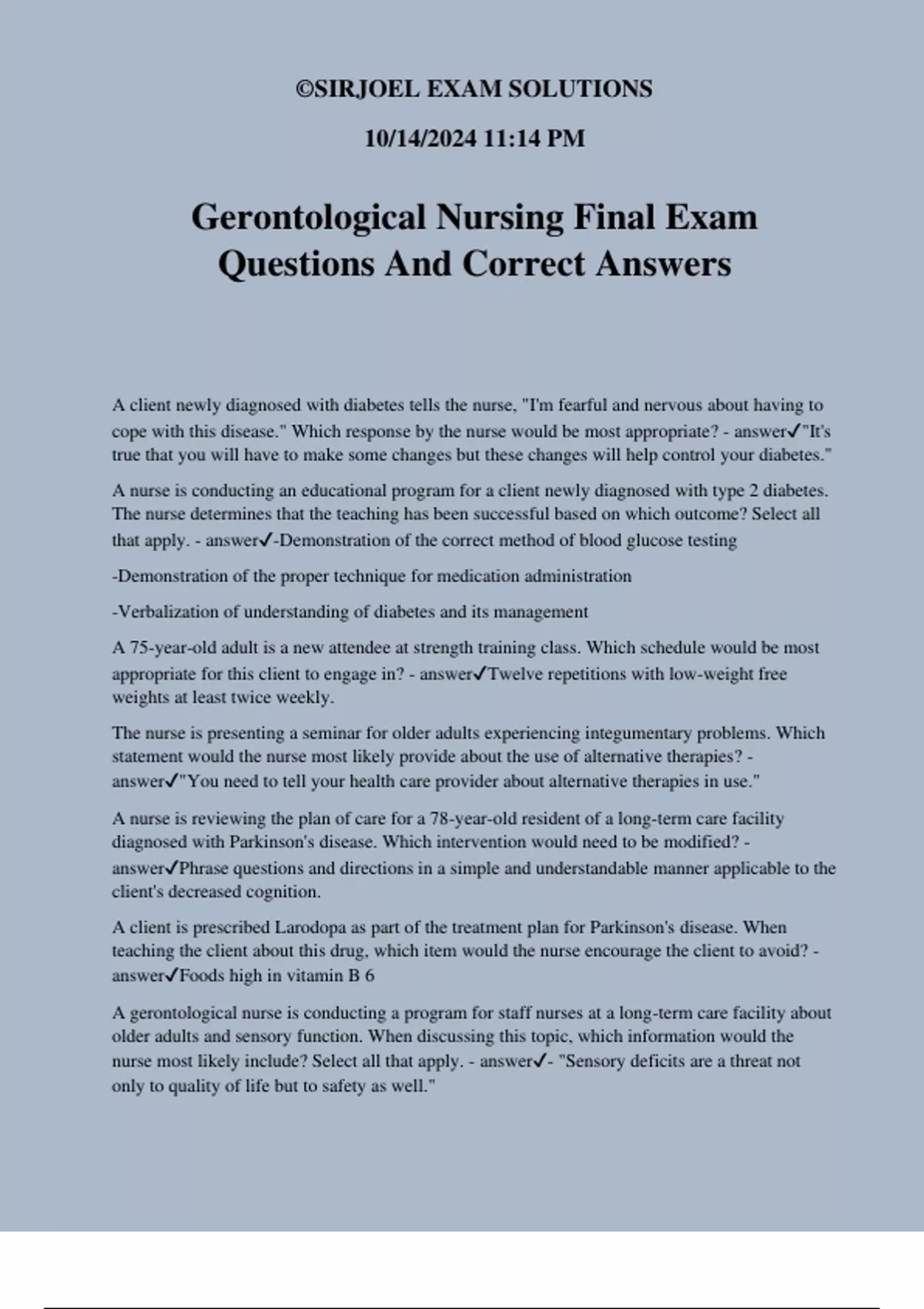 Gerontological Nursing Final Exam Questions And Correct Answers A client newly diagnosed with diabetes tells the nurse, "I'm fearful and nervous about having to cope with this disease." Which response by the nurse would be most appropriate? - answer"It's true that you will have to make some changes but these changes will help control your diabetes." A nurse is conducting an educational program for a client newly diagnosed with type 2 diabetes. The nurse determines that the teaching has been successful based on which outcome? Select all that apply. - answer-Demonstration of the correct method of blood glucose testing -Demonstration of the proper technique for medication administration -Verbalization of understanding of diabetes and its management A 75-year-old adult is a new attendee at strength training class. Which schedule would be most appropriate for this client to engage in? - answerTwelve repetitions with low-weight free weights at least twice weekly. The nurse is presenting a seminar for older adults experiencing integumentary problems. Which statement would the nurse most likely provide about the use of alternative therapies? - answer"You need to tell your health care provider about alternative therapies in use." A nurse is reviewing the plan of care for a 78-year-old resident of a long-term care facility diagnosed with Parkinson's disease. Which intervention would need to be modified? - answerPhrase questions and directions in a simple and understandable manner applicable to the client's decreased cognition. A client is prescribed Larodopa as part of the treatment plan for Parkinson's disease. When teaching the client about this drug, which item would the nurse encourage the client to avoid? - answerFoods high in vitamin B 6 A gerontological nurse is conducting a program for staff nurses at a long-term care facility about older adults and sensory function. When discussing this topic, which information would the nurse most likely include? Select all that apply. - answer- "Sensory deficits are a threat not only to quality of life but to safety as well." ©SIRJOEL EXAM SOLUTIONS 10/14/2024 11:14 PM - "Sensory losses commonly lead to impaired communication." - "Sensory deficits make it difficult to interpret the older adult's physical environment." - "Sensory deficits have a negative effect on older adults' social relationships." During client education of a 71-year-old who has a recent diagnosis of diabetes, the nurse has emphasized the importance of consistently maintaining blood glucose levels within the normal range rather than simply reacting to high or low levels. Which test would the nurse most likely identify as providing the best evaluation of the client's blood sugar control over time? - answerHemoglobin A1c A gerontological nurse is conducting a program for a group of nurses working at the long-term care facility about aging and musculoskeletal functioning. Which statement would the nurse most likely include when describing this relationship? - answerA combination of age-related reduction in muscle mass and inactivity decreases musculoskeletal function. A 70-year-old client has just been diagnosed with Parkinson's disease. The nurse is working with the client and family, teaching them about communicating with the client. Which information would the nurse incorporate into the discussion? - answerThe disease progresses slowly with therapy helping to minimize disability. An exercise physiologist approaches the gerontological nurse manager at a local assisted living facility about beginning an exercise program for the clients at the facility. When developing the program, which characteristic would the nurse manager require as being most important for the program to include? - answerAddressing cardiovascular endurance, flexibility, and strength training The nurse plans care for a client who has had gradual vision loss. Which of the following should the nurse include in the care plan? - answerA clock that chimes the hour in the client's living room The nurse is assessing an older adult client's hearing. Which finding would lead the nurse to suspect that the client is experiencing a problem? Select all that apply. - answer- Client looks directly at speaker's lips during interview - Client leans head to one side -Client consistently asking, "What did you say?" - Client asks to have words repeated A gerontological nurse is participating at a community health fair and is providing information to older adults about ways to promote healthy sensory function. Which suggestion would the nurse