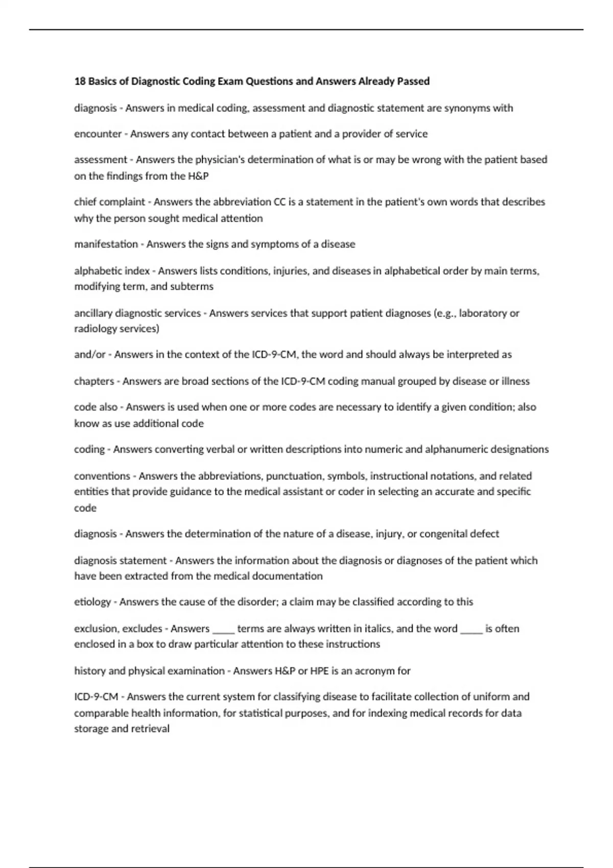 18 Basics of Diagnostic Coding Exam Questions and Answers Already Passed diagnosis - Answers in medical coding, assessment and diagnostic statement are synonyms with encounter - Answers any contact between a patient and a provider of service assessment - Answers the physician's determination of what is or may be wrong with the patient based on the findings from the H&P chief complaint - Answers the abbreviation CC is a statement in the patient's own words that describes why the person sought medical attention manifestation - Answers the signs and symptoms of a disease alphabetic index - Answers lists conditions, injuries, and diseases in alphabetical order by main terms, modifying term, and subterms ancillary diagnostic services - Answers services that support patient diagnoses (e.g., laboratory or radiology services) and/or - Answers in the context of the ICD-9-CM, the word and should always be interpreted as chapters - Answers are broad sections of the ICD-9-CM coding manual grouped by disease or illness code also - Answers is used when one or more codes are necessary to identify a given condition; also know as use additional code coding - Answers converting verbal or written descriptions into numeric and alphanumeric designations conventions - Answers the abbreviations, punctuation, symbols, instructional notations, and related entities that provide guidance to the medical assistant or coder in selecting an accurate and specific code diagnosis - Answers the determination of the nature of a disease, injury, or congenital defect diagnosis statement - Answers the information about the diagnosis or diagnoses of the patient which have been extracted from the medical documentation etiology - Answers the cause of the disorder; a claim may be classified according to this exclusion, excludes - Answers ____ terms are always written in italics, and the word ____ is often enclosed in a box to draw particular attention to these instructions history and physical examination - Answers H&P or HPE is an acronym for ICD-9-CM - Answers the current system for classifying disease to facilitate collection of uniform and comparable health information, for statistical purposes, and for indexing medical records for data storage and retrieval principal diagnosis - Answers the initial identification of the condition or complaint the patient expresses in the outpatient medical setting see - Answers the term ____ must always be followed and is found in the Alphabetic Index, volumes 2 and 3; it is a direction given to a coder to look in another place see also - Answers a direction given to the coder to look elsewhere if the main term or subterm(s) for that entry are not sufficient for coding the information see category - Answers a direction given to the coder to see a specific category (three-digit code); this must always be followed SOAP notes - Answers a system of charting that includes subjective findings, objective findings, assessment, and plan use additional code - Answers term that only appears in volume 1 in those subdivisions in which the user should add further information by means of an additional code to give a more complete picture of the diagnosis with, with mention of, associated with - Answers in the context of the ICD-9-CM the terms ___, ___, and ___ dictate that both parts of the title be present in the statement of the diagnosis in order to assign the particular code three-digit - Answers the code consists of a ___ category code that represents a specific disease, illness, condition, or injury within a general disease category two - Answers up to ___ additional digits can be used, which add further definition and specificity 1 & 2 - Answers volume(s) used for diagnostic coding by hospitals, physicians, and all other providers of service 1 - Answers also known as the Tabular Index, containing all of the diagnostic codes grouped into 17 chapters of disease and injury chapters - Answers broad sections of the ICD-9-CM coding manual grouped by disease or illness 2 - Answers volume used by hospitals to code procedures and services performed in the hospital environment section - Answers also called a chapter