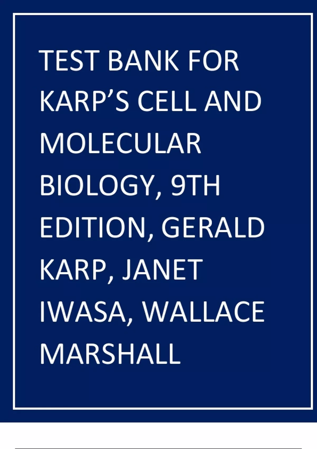 A test bank for "Karp's Cell and Molecular Biology" is a comprehensive resource designed to support educators and students in the study of cell and molecular biology concepts. Here’s a detailed description: Overview The test bank contains a wide range of questions aligned with the chapters and key topics covered in Karp's textbook, facilitating effective assessment and review. Content Features Question Variety: Includes multiple-choice, true/false, short answer, and essay questions to address different learning styles and assessment needs. Chapter Organization: Questions are systematically arranged by chapter, making it easy to find relevant material for specific topics. Diverse Difficulty Levels: Features questions that range from basic recall of facts to more complex questions that require critical thinking and application of concepts. Alignment with Learning Objectives: Each question is designed to reflect the learning objectives outlined in the textbook, ensuring relevance and educational value. Answer Keys and Explanations: Accompanies each question with an answer key and, where applicable, detailed explanations to aid understanding.