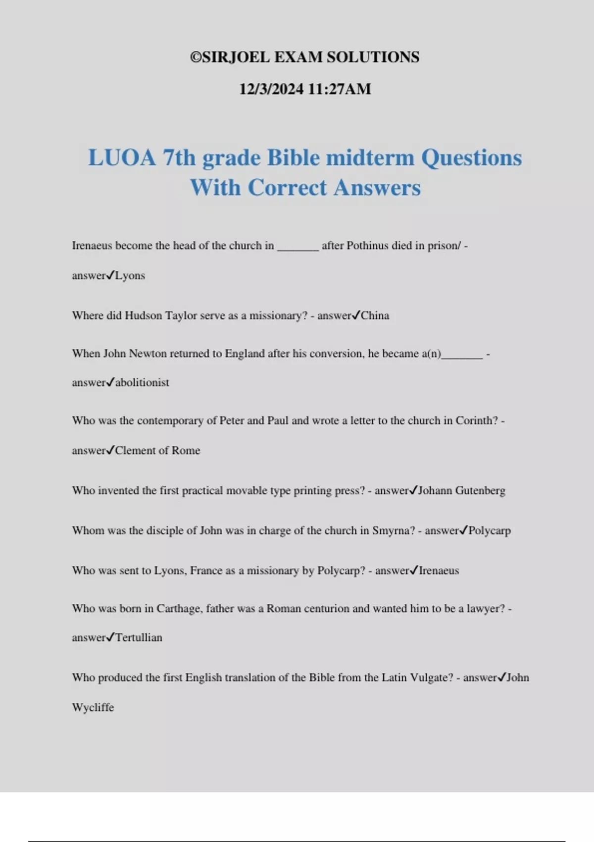 LUOA 7th grade Bible midterm Questions