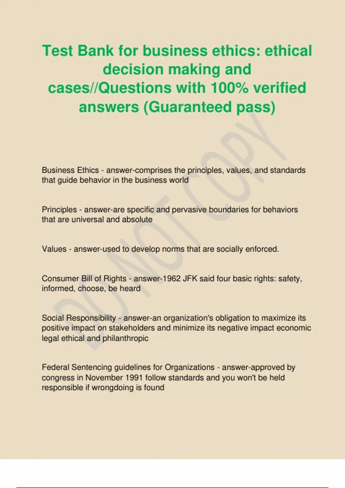 Test Bank for business ethics: ethical decision making and cases//Questions with 100% verified answers (Guaranteed pass)