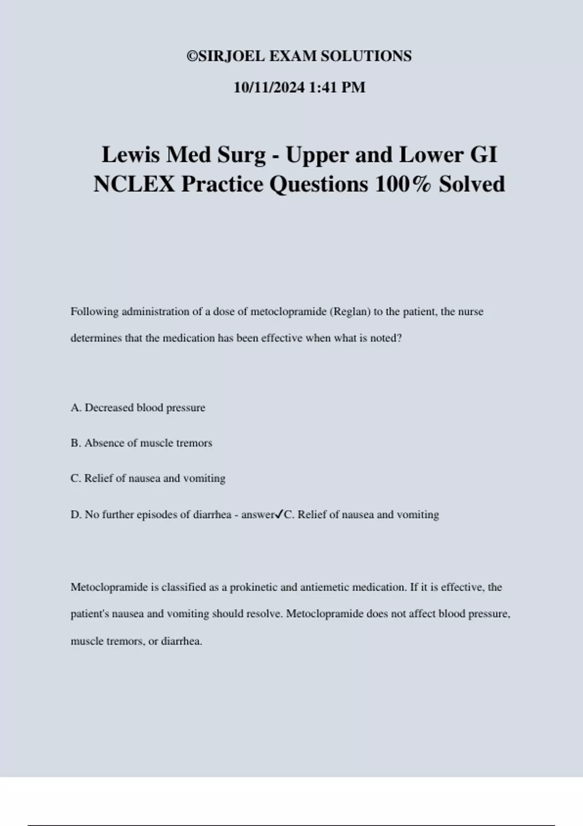 Lewis Med Surg - Upper and Lower GI NCLEX Practice Questions 100% Solved Following administration of a dose of metoclopramide (Reglan) to the patient, the nurse determines that the medication has been effective when what is noted? A. Decreased blood pressure B. Absence of muscle tremors C. Relief of nausea and vomiting D. No further episodes of diarrhea - answerC. Relief of nausea and vomiting Metoclopramide is classified as a prokinetic and antiemetic medication. If it is effective, the patient's nausea and vomiting should resolve. Metoclopramide does not affect blood pressure, muscle tremors, or diarrhea. ©SIRJOEL EXAM SOLUTIONS 10/11/2024 1:41 PM The patient receiving chemotherapy rings the call bell and reports the onset of nausea. The nurse should prepare an as-needed dose of which medication? A. Morphine sulfate B. Zolpidem (Ambien) C. Ondansetron (Zofran) D. Dexamethasone (Decadron) - answerOndansetron is a 5-HT3 receptor antagonist antiemetic that is especially effective in reducing cancer chemotherapy-induced nausea and vomiting. Morphine sulfate may cause nausea and vomiting. Zolpidem does not relieve nausea and vomiting. Dexamethasone is usually used in combination with ondansetron for acute and chemotherapy-induced emesis. The patient who is admitted with a diagnosis of diverticulitis and a history of irritable bowel disease and gastroesophageal reflux disease (GERD) has received a dose of Mylanta 30 mL PO. The nurse should evaluate its effectiveness by questioning the patient as to whether which symptom has been resolved? A. Diarrhea B. Heartburn ©SIRJOEL EXAM SOLUTIONS 10/11/2024 1:41 PM C. Constipation D. Lower abdominal pain - answerB. Heartburn Mylanta is an antacid that contains both aluminum and magnesium. It is indicated for the relief of GI discomfort, such as heartburn associated with GERD. Mylanta can cause both diarrhea and constipation as a side effect. Mylanta does not affect lower abdominal pain. A patient complains of nausea. When administering a dose of metoclopramide (Reglan), the nurse should teach the patient to report which potential adverse effect? A. Tremors B. Constipation C. Double vision D. Numbness in fingers and toes - answerA. Tremors Extrapyramidal side effects, including tremors and tardive dyskinesias, may occur as a result of metoclopramide (Reglan) administration. Constipation, double vision, and numbness in fingers and toes are not adverse effects of metoclopramide. ©