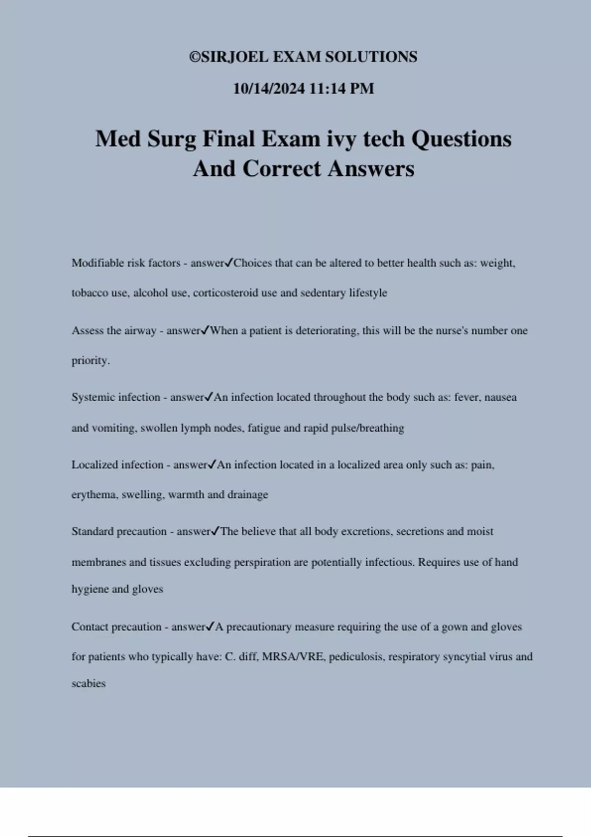 Med Surg Final Exam ivy tech Questions And Correct Answers Modifiable risk factors - answerChoices that can be altered to better health such as: weight, tobacco use, alcohol use, corticosteroid use and sedentary lifestyle Assess the airway - answerWhen a patient is deteriorating, this will be the nurse's number one priority. Systemic infection - answerAn infection located throughout the body such as: fever, nausea and vomiting, swollen lymph nodes, fatigue and rapid pulse/breathing Localized infection - answerAn infection located in a localized area only such as: pain, erythema, swelling, warmth and drainage Standard precaution - answerThe believe that all body excretions, secretions and moist membranes and tissues excluding perspiration are potentially infectious. Requires use of hand hygiene and gloves Contact precaution - answerA precautionary measure requiring the use of a gown and gloves for patients who typically have: C. diff, MRSA/VRE, pediculosis, respiratory syncytial virus and scabies ©SIRJOEL EXAM SOLUTIONS 10/14/2024 11:14 PM Droplet precaution - answerA precautionary measure requiring the use of a gown, gloves and mask for patients who typically have: diphtheria, streptococcal pharyngitis, pneumonia, influenza, rubella, mumps and pertussis Airborne precaution - answerA precautionary measure requiring the use of a gown, gloves and N95 mask for patients who typically have: tuberculosis, measles, varicella Peripheral arterial disease - answerThe most appropriate position for a patient to relieve pain is in the dependent position for this disease Patient should not wear compression stockings if this condition is present Magnetic resonance angiography - answerA diagnostic test for PVD that is commonly used to assess blood flow in the peripheral arteries with use of contrast medium to help visualize blood flow through arteries Doppler probe - answerA diagnostic test for PVD that is a segmental systolic blood pressure measurement of lower extremities at the thigh, calf and ankle Blood pressure readings in thigh and calf are normally higher than readings on the upper extremities. If pressures are lower than the brachial pressure, arterial disease may be present ©SIRJOEL EXAM SOLUTIONS 10/14/2024 11:14 PM Ankle-brachial index (ABI) - answerA diagnostic test for PVD that is a comparison of ankle and brachial pressure. A reading of less than 0.90 in either leg is diagnostic of PAD. Patients with diabetes are known to have a falsely elevated reading Plethysmography - answerA diagnostic test for PVD used to evaluate arterial flow in the lower extremities. If an occlusion is present, the waveforms are decreased to flattened, depending upon degree of occlusion Peripheral venous disease - answerThe patient with this condition can wear compression stockings and must be educated to wear above the bend of the knee to avoid deterring circulation Heparin and warfarin - answerAnticoagulants often given concurrently because warfarin depresses synthesis of clotting factors, but does not have an effect on clotting factors currently present Takes 3-4 days before the clotting factors that are present decay and the therapeutic effects of warfarin occur Fluid volume deficit - answerToo little fluid leading to dehydration and hypovolemia Fluid volume overload - answerToo much fluid leading to water intoxication and hypervolemia Fluid volume deficit: Cardiovascular - answerWhen reference fluid volume, this condition present as: