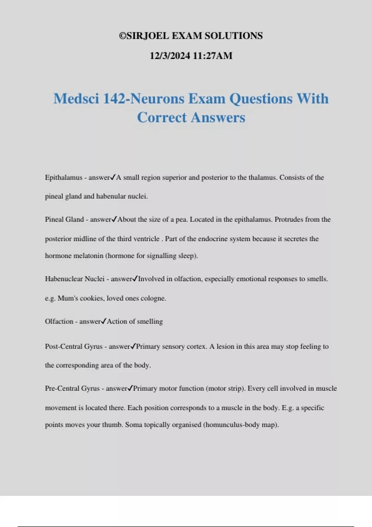 Medsci 142-Neurons Exam Questions With Correct Answers Epithalamus - answerA small region superior and posterior to the thalamus. Consists of the pineal gland and habenular nuclei. Pineal Gland - answerAbout the size of a pea. Located in the epithalamus. Protrudes from the posterior midline of the third ventricle . Part of the endocrine system because it secretes the hormone melatonin (hormone for signalling sleep). Habenuclear Nuclei - answerInvolved in olfaction, especially emotional responses to smells. e.g. Mum's cookies, loved ones cologne. Olfaction - answerAction of smelling Post-Central Gyrus - answerPrimary sensory cortex. A lesion in this area may stop feeling to the corresponding area of the body. Pre-Central Gyrus - answerPrimary motor function (motor strip). Every cell involved in muscle movement is located there. Each position corresponds to a muscle in the body. E.g. a specific points moves your thumb. Soma topically organised (homunculus-body map). ©SIRJOEL EXAM SOLUTIONS 12/3/2024 11:27AM Central Sulcus - answerKey defining landmark Frontal Lobe - answerFrontal association cortex-Intelligence, personality, behaviour, mood, cognitive function Occipital Lobe - answerSlightly more tightly packed gyrus Temporal Lobe - answerTemporal association cortex-memory, mood, aggression, intelligence Pariental Lobe - answerParietal association cortex-spatial skills, 3D recognition, shapes, face, concept, abstract, perception. Pareto Occipital Sulcus - answer Lateral Fissure - answerChasm most obvious Wernicke's Area - answerSecondary auditory cortex. Identifies sounds. Higher processing e.g. pen clicking in the background, interpret speech. Fluent Aphasia - answerA lesion in the Wernick's area. This means able to talk but not make any sense. able to understand speech. To test this you ask them a question and if they answer in way that is not comprehendible then they have fluent aphasia Broca's Area - answerLocated next to the pre-central sulcus. The ability to formulate speech. Area right next to where the point where lip motion is located on the pre-central gyrus. ©SIRJOEL EXAM SOLUTIONS 12/3/2024 11:27AM Arcuate Fascicules - answerA connection between the Wernicke's area and the Broca's area. Arch shaped. Millions of fibres connecting them. This allows the brain to understand speech and than formulate speech effectively. Connectional Aphasia - answerA lesion located on the arcuate fascicules. this is tested by telling the person to copy what you say and if they can't they have this type of aphasia Non-Fluent Aphasia/ Motor Aphasia - answerA lesion located on the Broca's area. This is when the person cannot formulate speech Primary Auditory Cortex - answerLocated next to the Wernicke's area. Responsible to take info from your other side of the body celled totemic representation. Divides tones and moves them into the Wernicke's area. Angular Gyrus - answerlocated close to the post-central gyrus. located on the inferior gyrus. Involved in writing for planning and carrying out the action. Supra-marginal Gyrus - answerNext to the angular gyrus. For the planning and action of reading. Exner's Area - answerHas to two parts. the top part are muscles for the eye and hand. The bottom part are the muscles for reading writing. Forebrain, Midbrain, Hindbrain - answer Primary Visual Cortex - answerSense of sight