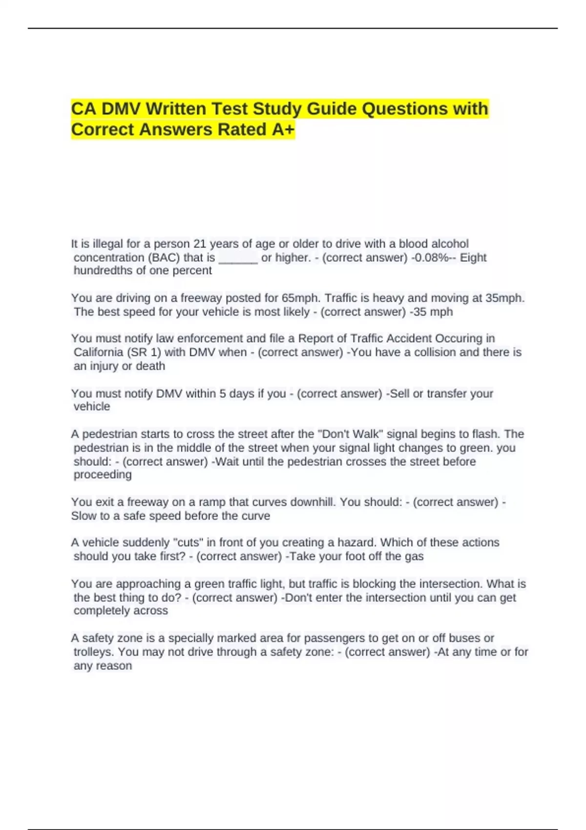 CA DMV Written Test Study Guide Questions with Correct Answers Rated A.