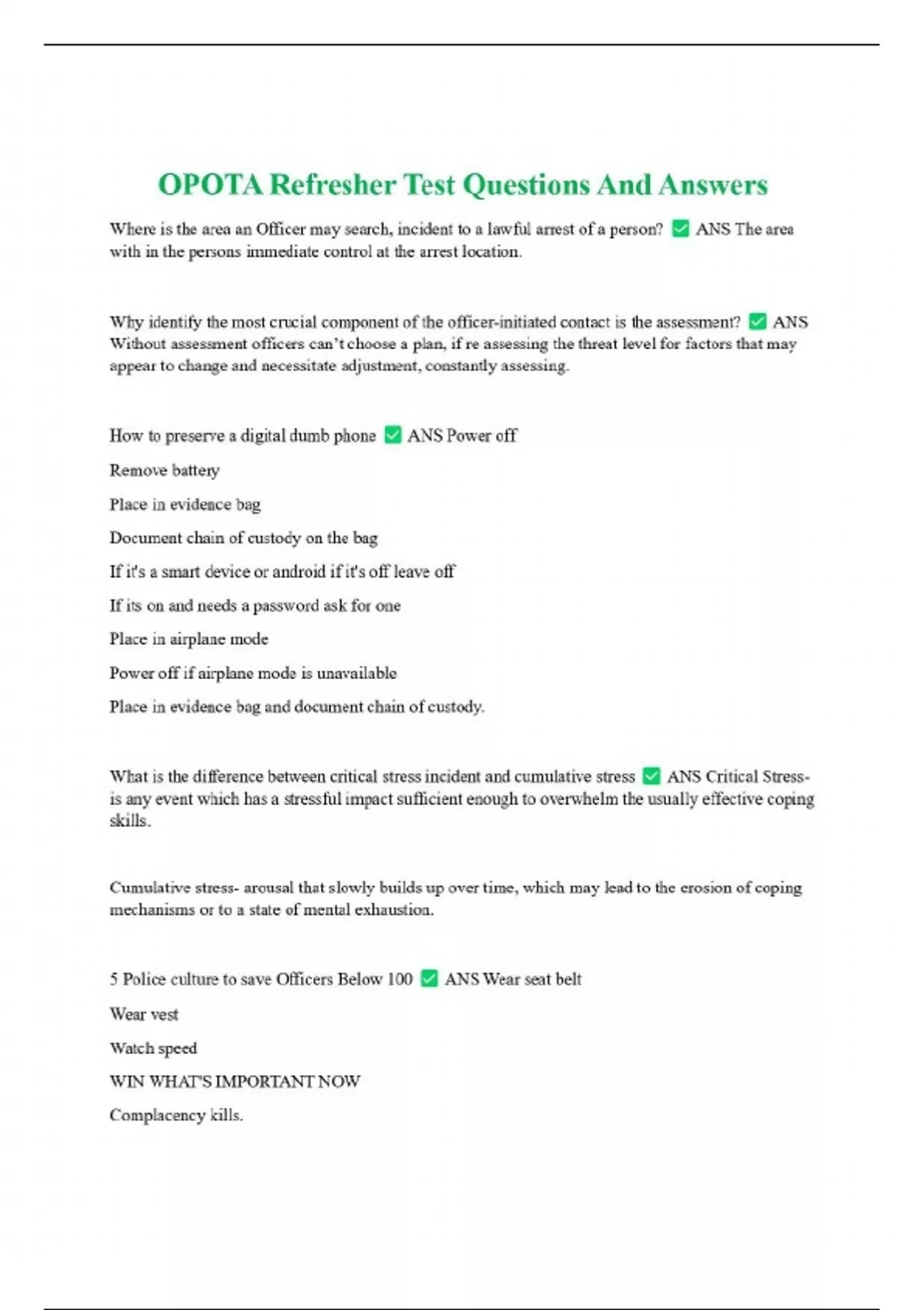 OPOTA Refresher Test Questions And Answers Where is the area an Officer may search, incident to a lawful arrest of a person? ANS The area with in the persons immediate control at the arrest location. Why identify the most crucial component of the officer-initiated contact is the assessment? ANS Without assessment officers can’t choose a plan, if re assessing the threat level for factors that may appear to change and necessitate adjustment, constantly assessing. How to preserve a digital dumb phone ANS Power off Remove battery Place in evidence bag Document chain of custody on the bag If it's a smart device or android if it's off leave off If its on and needs a password ask for one