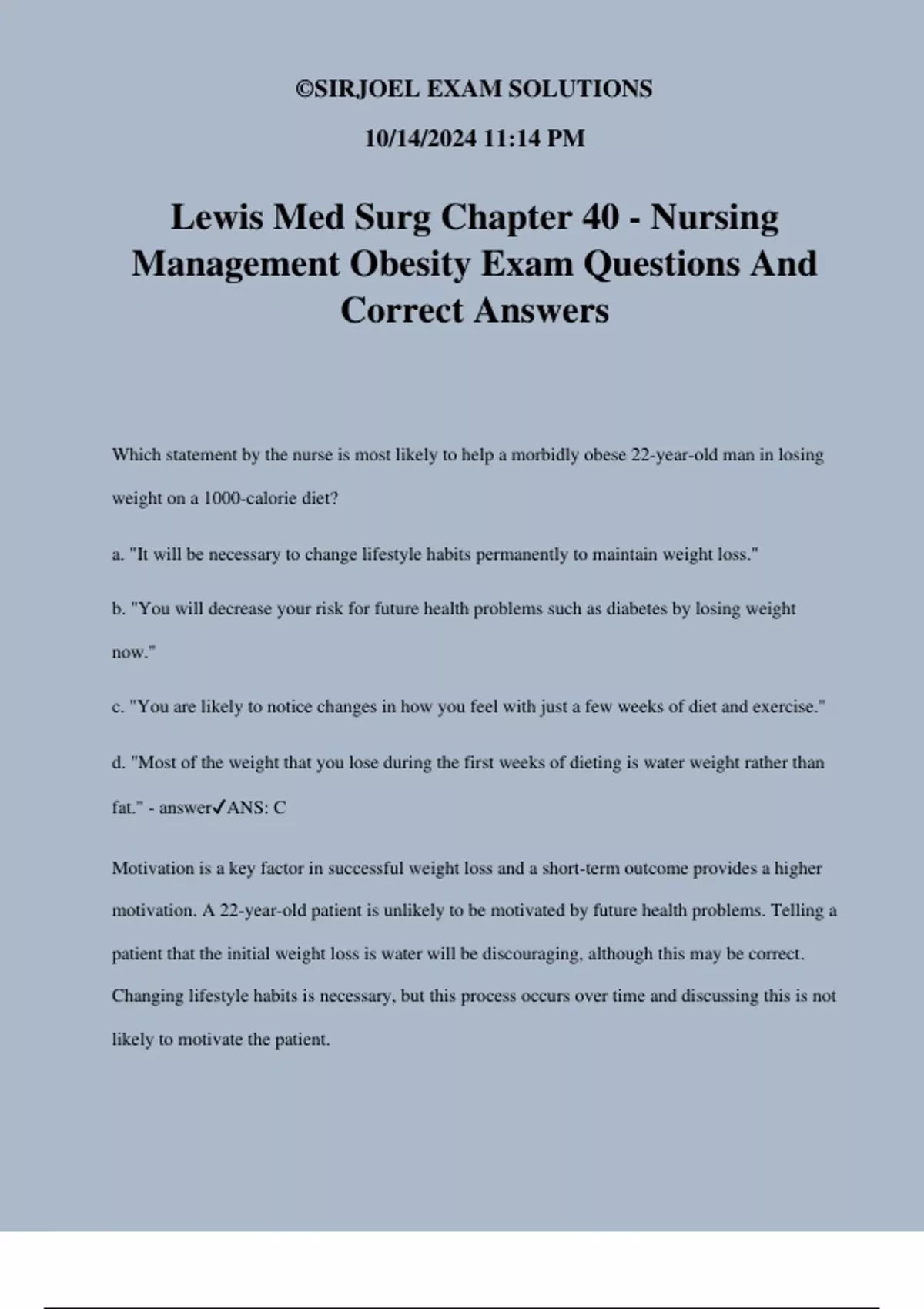 Lewis Med Surg Chapter 40 - Nursing Management Obesity Exam Questions And Correct Answers Which statement by the nurse is most likely to help a morbidly obese 22-year-old man in losing weight on a 1000-calorie diet? a. "It will be necessary to change lifestyle habits permanently to maintain weight loss." b. "You will decrease your risk for future health problems such as diabetes by losing weight now." c. "You are likely to notice changes in how you feel with just a few weeks of diet and exercise." d. "Most of the weight that you lose during the first weeks of dieting is water weight rather than fat." - answerANS: C Motivation is a key factor in successful weight loss and a short-term outcome provides a higher motivation. A 22-year-old patient is unlikely to be motivated by future health problems. Telling a patient that the initial weight loss is water will be discouraging, although this may be correct. Changing lifestyle habits is necessary, but this process occurs over time and discussing this is not likely to motivate the patient. ©SIRJOEL EXAM SOLUTIONS 10/14/2024 11:14 PM After the nurse teaches a patient about the recommended amounts of foods from animal and plant sources, which menu selections indicate that the initial instructions about diet have been understood? a. 3 oz of lean beef, 2 oz of low-fat cheese, and a tomato slice b. 3 oz of roasted pork, a cup of corn, and a cup of carrot sticks c. Cup of tossed salad and nonfat dressing topped with a chicken breast d. Half cup of tuna mixed with nonfat mayonnaise and a half cup of celery - answerANS: B This selection is most consistent with the recommendation of the American Institute for Cancer Research that one third of the diet should be from animal sources and two thirds from plant source foods. The other choices all have higher ratios of animal origin foods to plant source foods than would be recommended. Which nursing action is appropriate when coaching obese adults enrolled in a behavior modification program? a. Having the adults write down the caloric intake of each meal b. Asking the adults about situations that tend to increase appetite c. Suggesting that the adults plan rewards, such as sugarless candy, for achieving their goals d. Encouraging the adults to eat small amounts frequently rather than having scheduled meals - answerANS:
