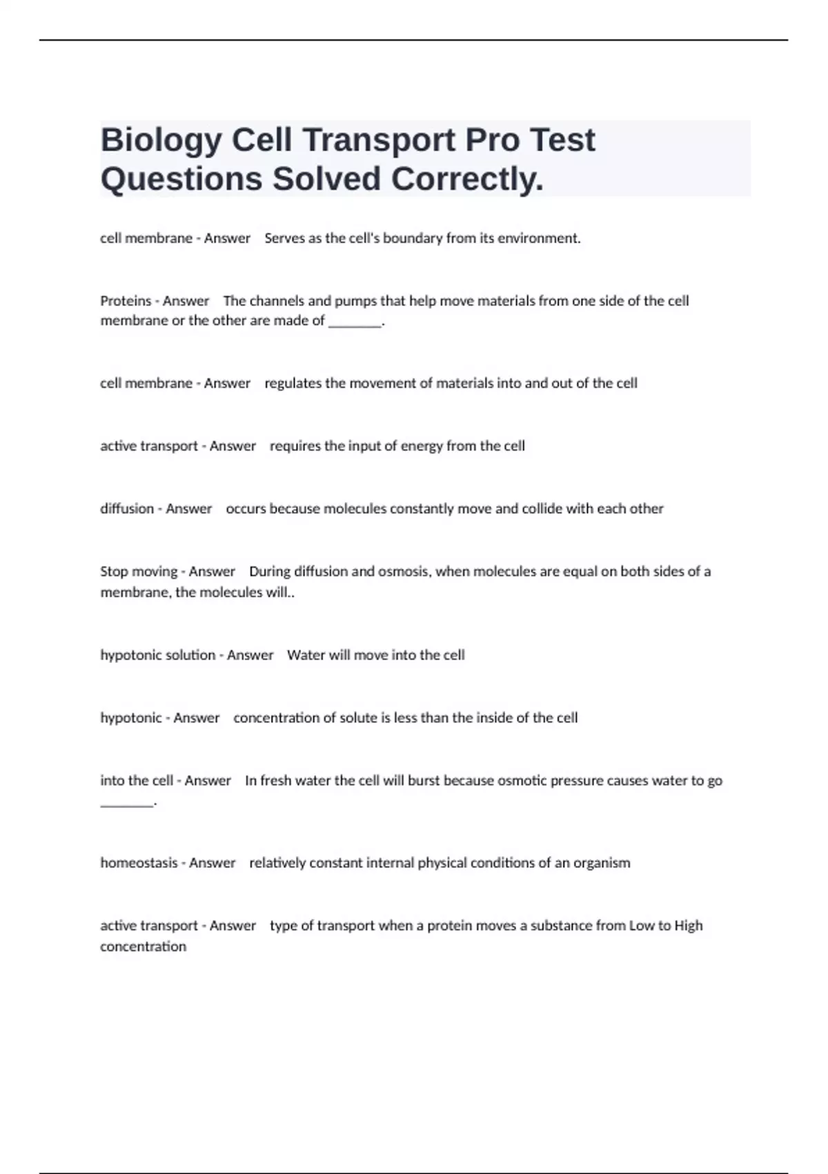 Biology Cell Transport Pro Test Questions Solved Correctly.