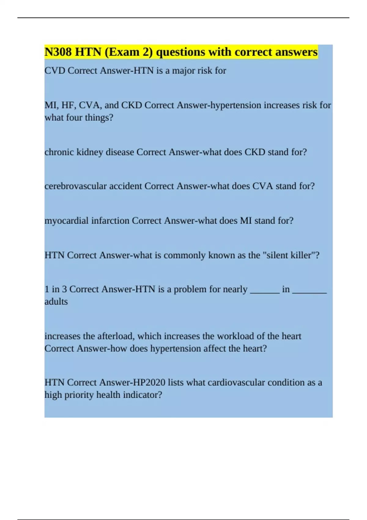 N308 HTN (Exam 2) questions with correct answers