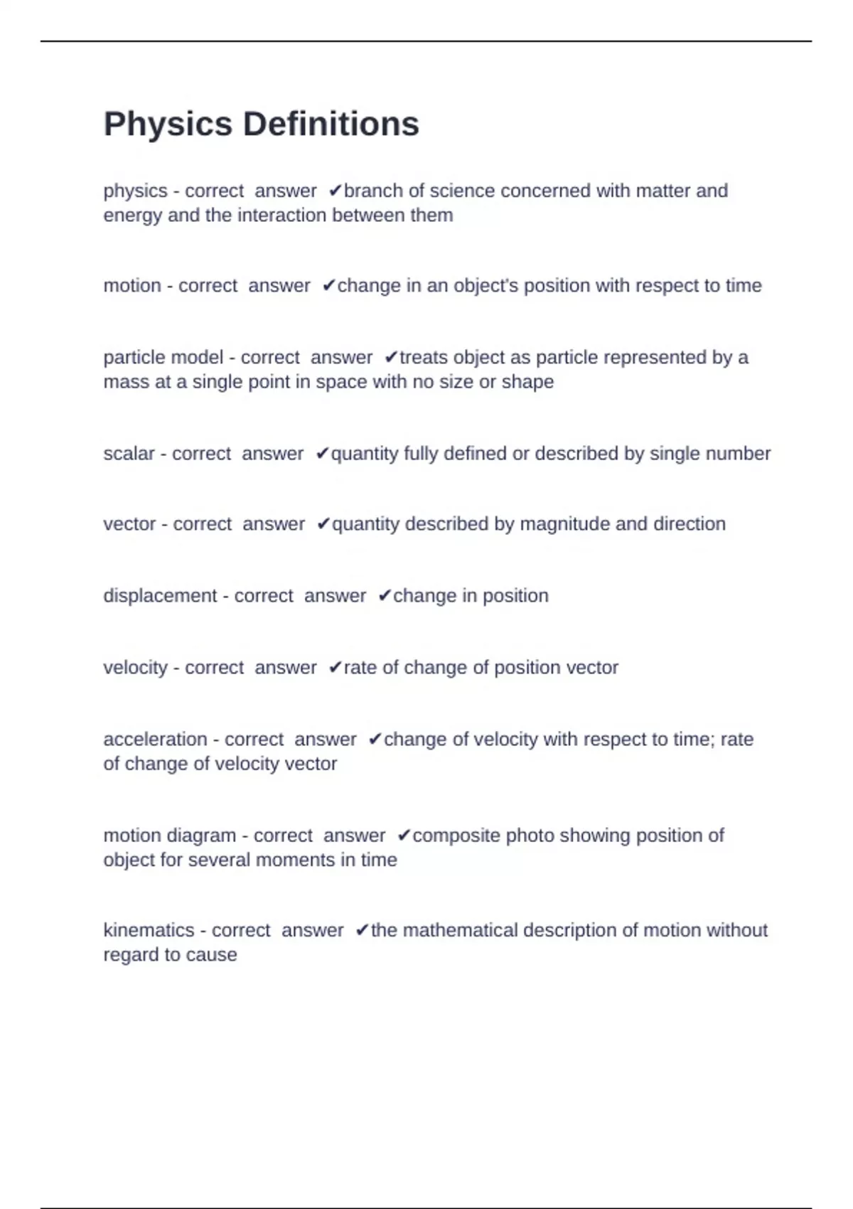 Physics Definitions Question and answers correctly solved Physics Definitions physics - correct answer branch of science concerned with matter and energy and the interaction between them motion - correct answer change in an object's position with respect to time particle model - correct answer treats object as particle represented by a mass at a single point in space with no size or shape scalar - correct answer quantity fully defined or described by single number vector - correct answer quantity described by magnitude and direction displacement - correct answer change in position velocity - correct answer rate of change of position vector acceleration - correct answer change of velocity with respect to time; rate of change of veloc