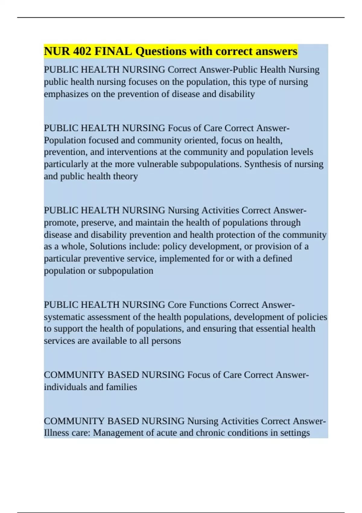 PUBLIC HEALTH NURSING Correct Answer-Public Health Nursing