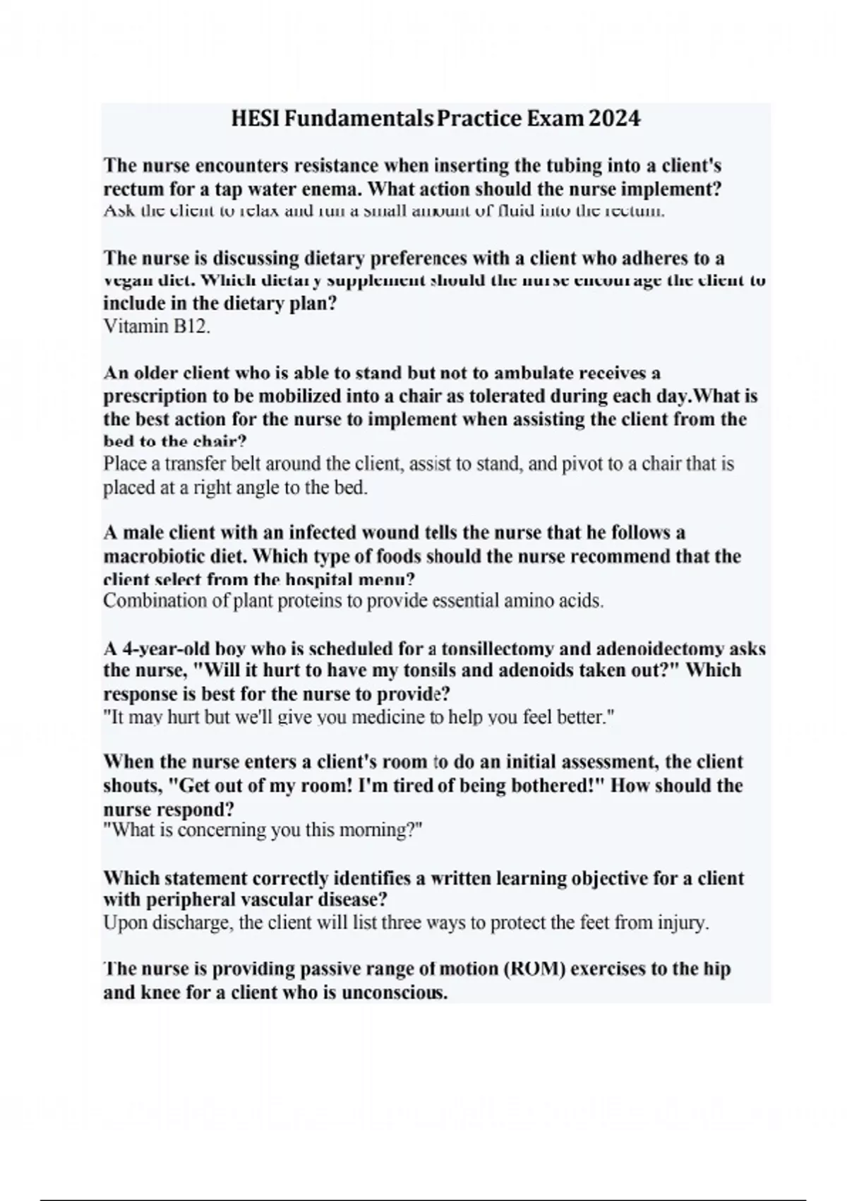 The nurse encounters resistance when inserting the tubing into a client's rectum for a tap water enema. What action should the nurse implement? Ask the client to relax and run a small amount of fluid into the rectum. The nurse is discussing dietary preferences with a client who adheres to a vegan diet. Which dietary supplement should the nurse encourage the client to include in the dietary plan? Vitamin B12. An older client who is able to stand but not to ambulate receives a prescription to be mobilized into a chair as tolerated during each day.What is the best action for the nurse to implement when assisting the client from the bed to the chair? Place a transfer belt around the client, assist to stand, and pivot to a chair that is placed at a right angle to the bed. A male client with an infected wound tells the nurse that he follows a macrobiotic diet. Which type of foods should the nurse recommend that the client select from the hospital menu? Combination of plant proteins to provide essential amino acids. A 4-year-old boy who is scheduled for a tonsillectomy and adenoidectomy asks the nurse, "Will it hurt to have my tonsils and adenoids taken out?" Which response is best for the nurse to provide? "It may hurt but we'll give you medicine to help you feel better." When the nurse enters a client's room to do an initial assessment, the client shouts, "Get out of my room! I'm tired of being bothered!" How should the nurse respond? "What is concerning you this morning?" Which statement correctly identifies a written learning objective for a client with peripheral vascular disease? Upon discharge, the client will list three ways to protect the feet from injury. The nurse is providing passive range of motion (ROM) exercises to the hip and knee for a client who is unconscious. After supporting the client's knee with one hand, what action should the nurse take next? Cradle the client's heel. While preparing to insert a rectal suppository in a male adult client, the nurse observes that the client is holding his breath while bearing down. What action should the nurse implement? Instruct the client to take slow deep breaths and stop bearing down. What action should the nurse implement when adding sterile liquids to a sterile field? Consider the sterile field contaminated if it becomes wet during the procedure. When assessing a client with a nursing diagnosis of fluid volume deficit, the nurse notes that the client's skin over the sternum "tents" when gently pinched. Which action should the nurse implement? Continue the planned nursing interventions to restore the client's fluid volume. A client is admitted to the hospital with intractable pain. What instruction should the nurse provide the unlicensed assistive personnel (UAP) who is preparing to assist this client with a bed bath? Take measures to promote as much comfort as possible. The nurse is preparing to irrigate a client's indwelling urinary catheter using an open technique. What action should the nurse take after applying gloves? Draw up the irrigating solution into the syringe. The nurse is administering an intermittent infusion of an antibiotic to a client who’s intravenous (IV) access is an antecubital saline lock. After the nurse opens the roller clamp on the IV tubing, the alarm on the infusion pump indicates an obstruction. What action should the nurse take first? Reposition the client's arm. What intervention should the nurse include in the plan of care for a client who is being treated with an Unna’s paste boot for leg ulcers due to chronic venous insufficiency? Check capillary refill of toes on lower extremity with Unna's paste boot. A client is admitted with a stage four pressure ulcer that has a black, hardened surface and a light-pink wound bed with a malodorous green drainage. Which dressing is best for the nurse to use first? Wet to moist dressing. A female client informs the nurse that she uses herbal therapies to supplement her diet and manage common ailments. What information should the nurse offer the client about general use of herbal supplements? Herbs should be obtained from manufacturers with a history of quality control of their supplements. The nurse removes the dressing on a client's heel that is covering a pressure sore one-inch in diameter and finds that there is straw-colored drainage seeping from the wound. What description of this finding should the nurse include in the client's record? One-inch pressure sore draining serous fluid. The charge nurse assigns a nursing procedure to a new staff nurse who has not previously performed the procedure. What action is most important for the new staff nurse to take? Refuse to perform the task that is beyond the nurse's experience. A female client who has breast cancer with metastasis to the liver and spine is admitted with constant, severe pain despite around-the-clock use of oxycodone (Percodan) and amitriptyline (Elavil) for pain control at home. During the admission assessment, which information is most important for the nurse to obtain? Sensory pattern, area, intensity, and nature of the pain. What action by the nurse demonstrates culturally sensitive care? Asks permission before touching a client. A client in hospice care develops audible gurgling sounds on inspiration. Which nursing action has the highest priority? Inform the family that death is imminent. A client who has moderate, persistent, chronic neuropathic pain due to diabetic neuropathy takes gabapentin (Neurontin) and ibuprofen (Motrin, Advil) daily. If Step 2 of the World Health Organization (WHO) pain relief ladder is prescribed, which drug protocol should be implemented? Continue gabapentin. When preparing to administer an intravenous medication through a central venous catheter, the nurse aspirates a blood return in one of the lumens of the triple lumen catheter. Which action should the nurse implement? Flush the lumen with the saline solution and administer the medication through the lumen. How s