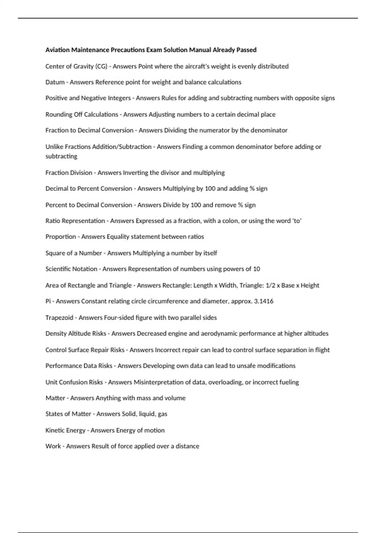Aviation Maintenance Precautions Exam Solution Manual Already Passed Center of Gravity (CG) - Answers Point where the aircraft's weight is evenly distributed Datum - Answers Reference point for weight and balance calculations Positive and Negative Integers - Answers Rules for adding and subtracting numbers with opposite signs Rounding Off Calculations - Answers Adjusting numbers to a certain decimal place Fraction to Decimal Conversion - Answers Dividing the numerator by the denominator Unlike Fractions Addition/Subtraction - Answers Finding a common denominator before adding or subtracting Fraction Division - Answers Inverting the divisor and multiplying Decimal to Percent Conversion - Answers Multiplying by 100 and adding % sign Percent to Decimal Conversion - Answers Divide by 100 and remove % sign Ratio Representation - Answers Expressed as a fraction, with a colon, or using the word 'to' Proportion - Answers Equality statement between ratios Square of a Number - Answers Multiplying a number by itself Scientific Notation - Answers Representation of numbers using powers of 10 Area of Rectangle and Triangle - Answers Rectangle: Length x Width, Triangle: 1/2 x Base x Height Pi - Answers Constant relating circle circumference and diameter, approx. 3.1416 Trapezoid - Answers Four-sided figure with two parallel sides Density Altitude Risks - Answers Decreased engine and aerodynamic performance at higher altitudes Control Surface Repair Risks - Answers Incorrect repair can lead to control surface separation in flight Performance Data Risks - Answers Developing own data can lead to unsafe modifications Unit Confusion Risks - Answers Misinterpretation of data, overloading, or incorrect fueling Matter - Answers Anything with mass and volume States of Matter - Answers Solid, liquid, gas Kinetic Energy - Answers Energy of motion Work - Answers Result of force applied over a distance Lever Components - Answers Rigid bar and fulcrum for pivoting Second-Class Lever - Answers Type of lever with the load between the fulcrum and effort Thermal Expansion Impact - Answers All states affected, gas most significantly British Thermal Unit (BTU) - Answers Heat energy to raise 1 lb of water by 1°F Heat Transfer Methods - Answers Conduction, convection, radiation Absolute Zero - Answers Temperature where molecular motion stops Liquid Compression - Answers Liquids are generally incompressible Pressure Units - Answers Pounds per square inch (psi) Pressure Transmission in Liquids - Answers Equal transmission in all directions Force-Pressure-Area Relationship - Answers Force = Pressure x Area Speed of Sound at Sea Level - Answers Approximately 1,125 ft/s on a standard day Force Formula - Answers Force equals area times pressure Speed of Sound - Answers Approximately 661 knots or 340 meters per second Atmospheric Pressure at Sea Level - Answers 29.92 inches of Mercury or 1013.2 millibars Standard Day Temperature - Answers 59 deg. F or 15 deg. C Density Altitude Factors - Answers Temperature and atmospheric pressure Relative Humidity - Answers Ratio of actual moisture to saturation in the air Principle Forces on Airplane - Answers Lift, drag, thrust, and gravity Angle of Attack - Answers Angle between relative wind and airfoil chord line Wing Stall Factors - Answers Exceeding critical angle of attack causing airflow separation Flaps Effects - Answers Increase lift, drag, decrease stall speed Vortex Generator Function - Answers Prevents airflow separation on wing during high-speed flight Blade Flapping in Helicopter - Answers Compensates for lift dissymmetry on rotor blades Airflow in Helicopter Autorotation - Answers Downward in normal flight, upward in autorotation Friction - Answers Opposition to relative motion between objects in contact Kilowatt to Watts Conversion - Answers 1 kilowatt = 1,000 watts Ohm's Law - Answers Fundamental relationship in electrical circuits Elements of Ohm's Law - Answers Voltage, current, resistance Ohm's Law Equations - Answers E=I x R, R = E/I, or I= E/R Current Change with Voltage Doubling - Answers Current also doubles in a DC circuit Power Measurement in DC Circuits - Answers Measured in watts Elements of Electrical Circuit - Answers Energy source, load, and conductors Types of DC Circuits - Answers Series, parallel, and complex (series-parallel) Cells in 24-Volt Lead-Acid Battery - Answers 12 cells Specific Gravity of Charged Lead-Acid Battery - Answers Varies between 1.275 and 1.3 Specific Gravity Correction Temp Range - Answers Below 70 deg. F or above 90 deg. F Battery Storage Precaution - Answers Separate facilities for different battery types Ni-Cad Battery State of Charge - Answers Cannot be determined by electrolyte specific gravity Advantage of AC over DC - Answers Efficient long-distance power transmission Opposition to AC Current Flow - Answers Resistance, inductive reactance, capacitive reactance Inductance Definition - Answers Opposite induced voltage to applied voltage Capacitance Creation Component - Answers A capacitor Capacitor Electricity Storage - Answers Energy stored in electrostatic charge between conductors Impedance in AC Circuits - Answers Total opposition to current flow Ni-Cad Battery Failure Causes - Answers Faulty cells or cell imbalance Multimeter Measurements - Answers Typically measure voltage, current, and resistance. Tolerance on Aircraft Drawings - Answers Controls part fit; incorrect sizes can damage structure.