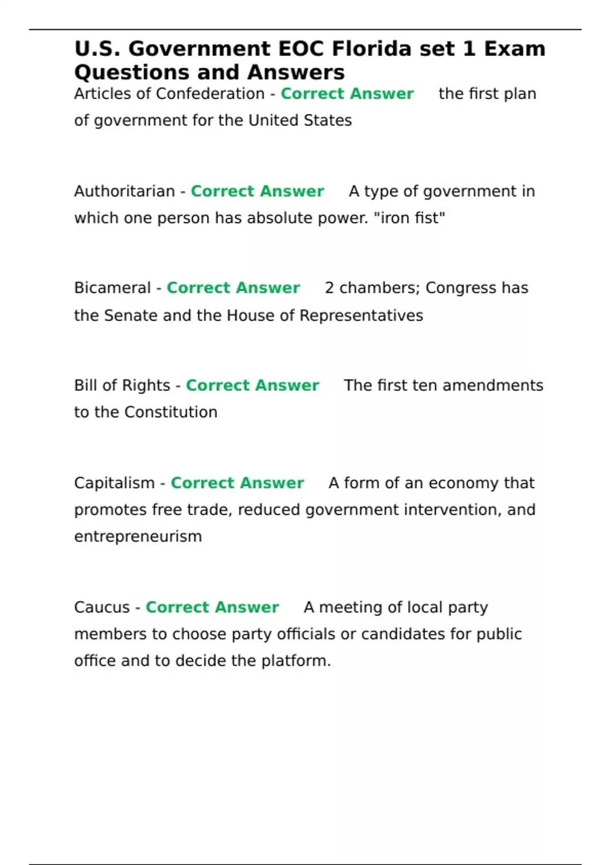 U.S. Government EOC Florida set 1 Exam Questions and Answers