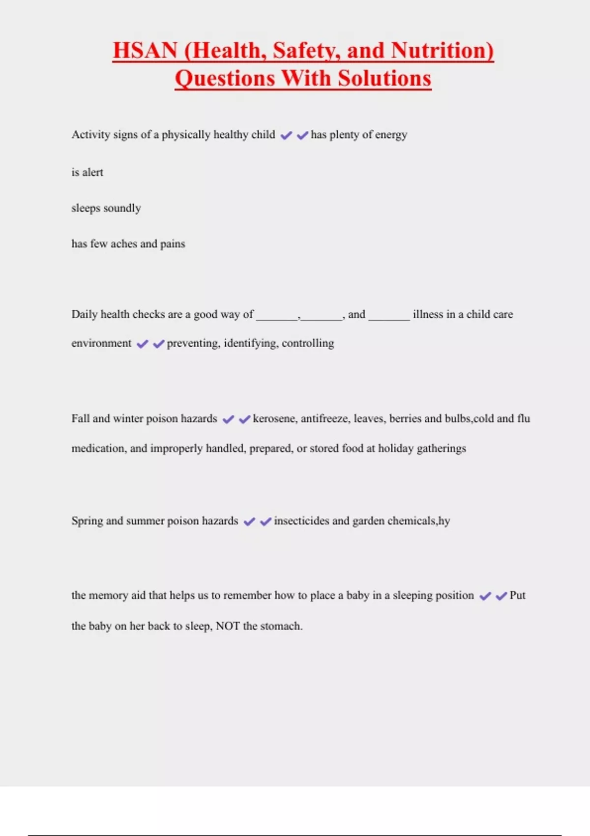 HSAN (Health, Safety, and Nutrition) Questions With Solutions Activity signs of a physically healthy child has plenty of energy is alert sleeps soundly has few aches and pains Daily health checks are a good way of _______,_______, and _______ illness in a child care environment preventing, identifying, controlling Fall and winter poison hazards kerosene, antifreeze, leaves, berries and bulbs,cold and flu medication, and improperly handled, prepared, or stored food at holiday gatherings Spring and summer poison hazards insecticides and garden chemicals,hy