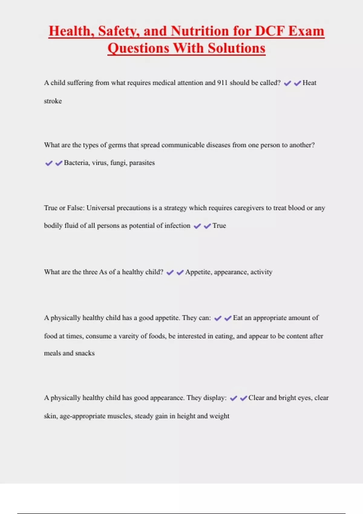 Health, Safety, and Nutrition for DCF Exam Questions With Solutions A child suffering from what requires medical attention and 911 should be called? Heat stroke What are the types of germs that spread communicable diseases from one person to another? Bacteria, virus, fungi, parasites True or False: Universal precautions is a strategy which requires caregivers to treat blood or any bodily fluid of all persons as potential of infection True What are the three As of a healthy child? Appetite, appearance, activity