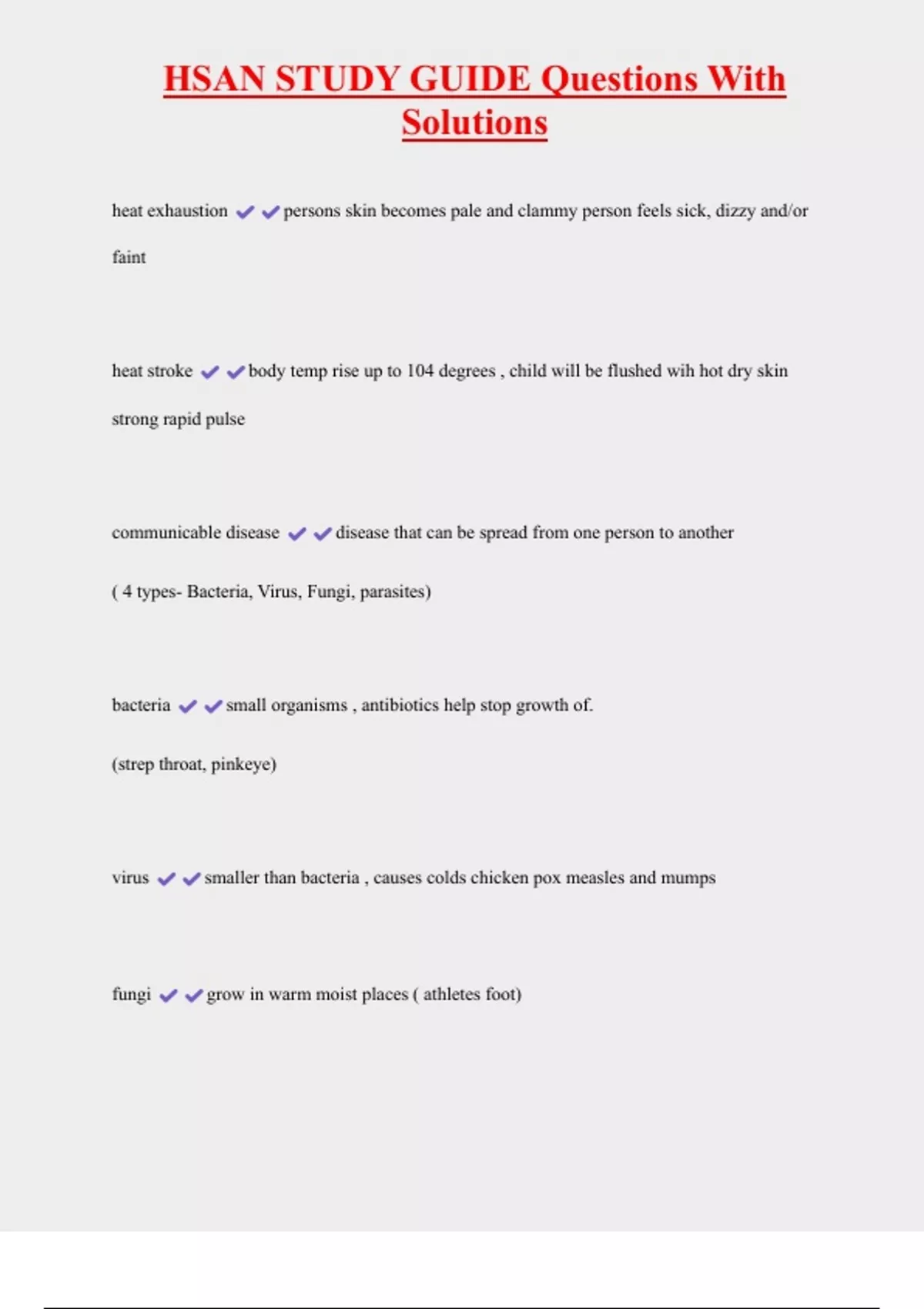 HSAN STUDY GUIDE Questions With Solutions heat exhaustion persons skin becomes pale and clammy person feels sick, dizzy and/or faint heat stroke body temp rise up to 104 degrees , child will be flushed wih hot dry skin strong rapid pulse communicable disease disease that can be spread from one person to another ( 4 types- Bacteria, Virus, Fungi, parasites) bacteria small organisms , antibiotics help stop growth of. (strep throat, pinkeye)