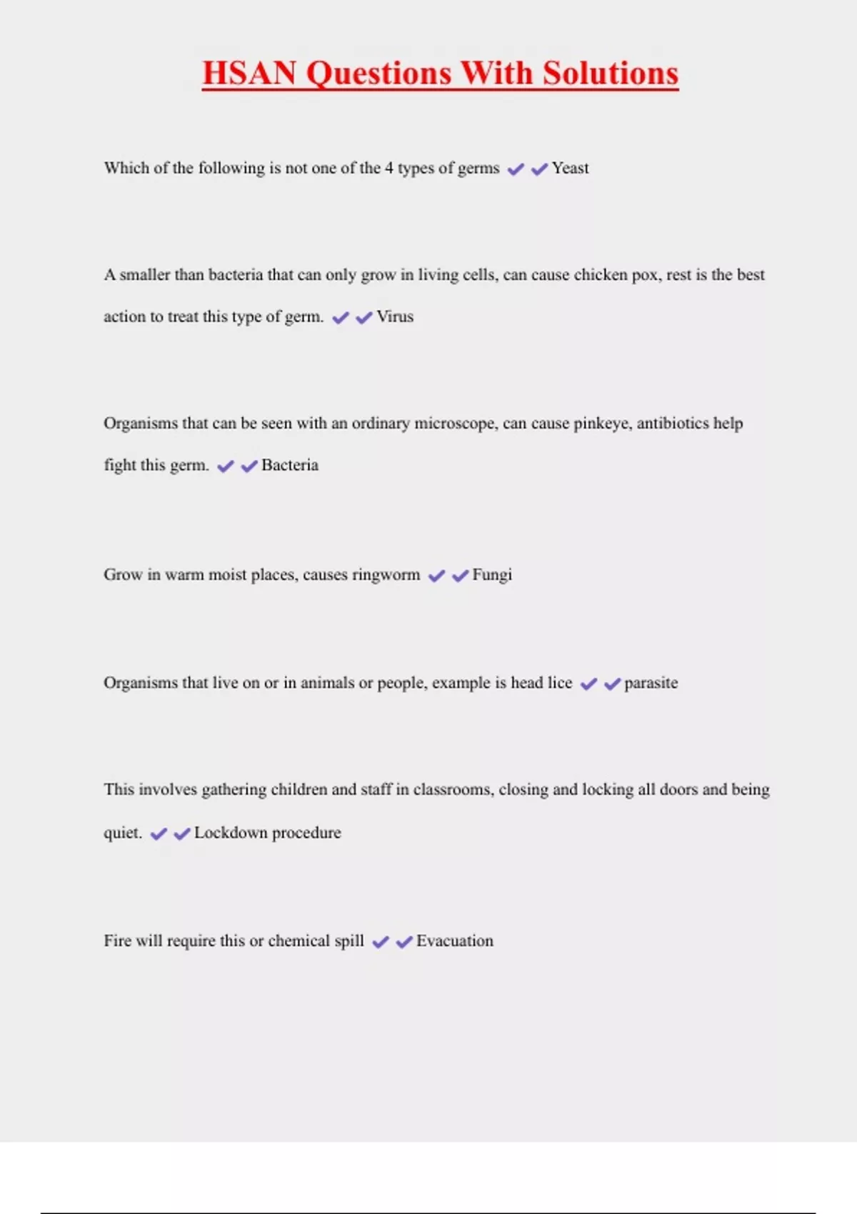 HSAN Questions With Solutions Which of the following is not one of the 4 types of germs Yeast A smaller than bacteria that can only grow in living cells, can cause chicken pox, rest is the best action to treat this type of germ. Virus Organisms that can be seen with an ordinary microscope, can cause pinkeye, antibiotics help fight this germ. Bacteria Grow in warm moist places, causes ringworm Fungi Organisms that live on or in animals or people, example is head lice parasite