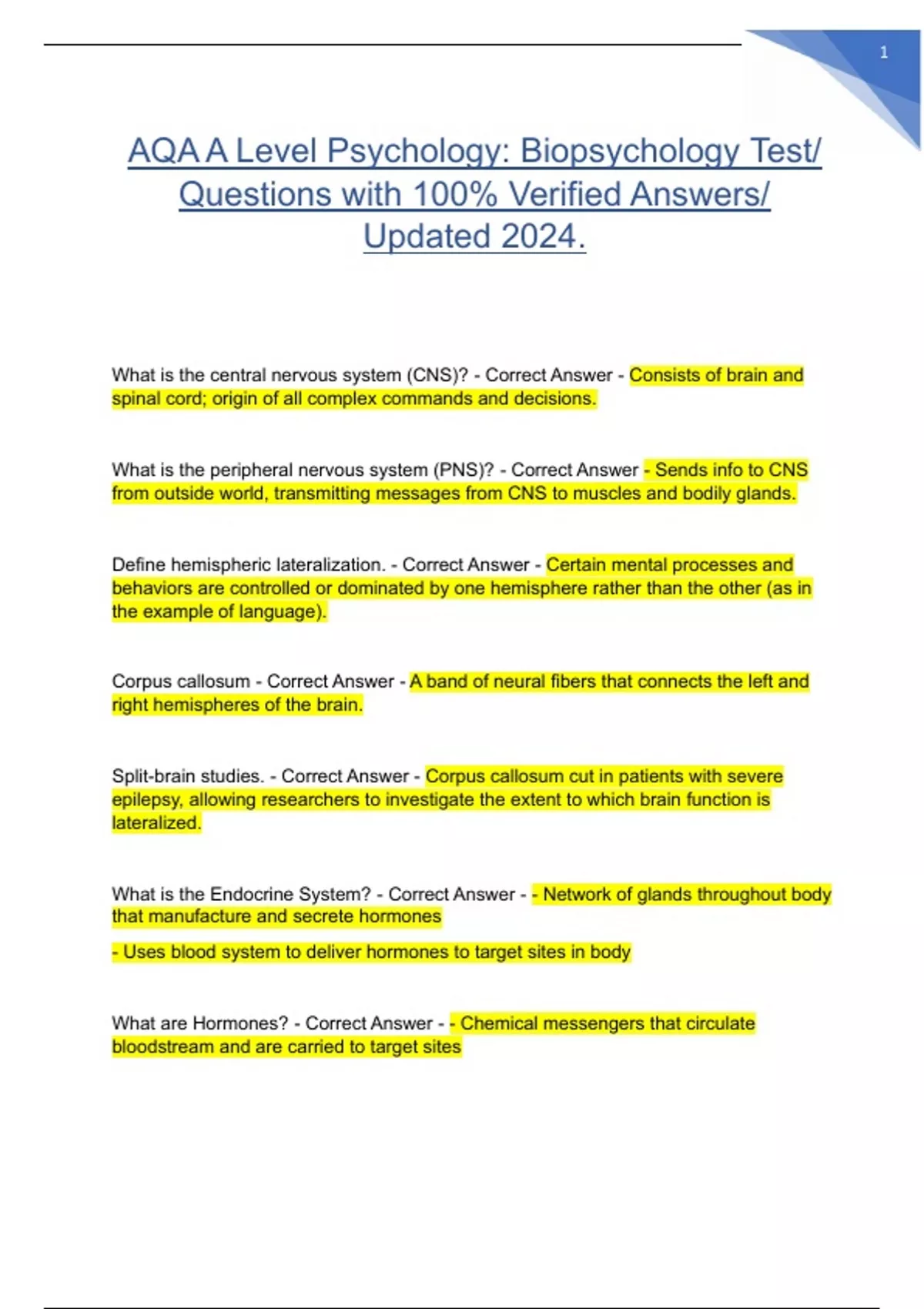 AQA A Level Psychology: Biopsychology Test/
