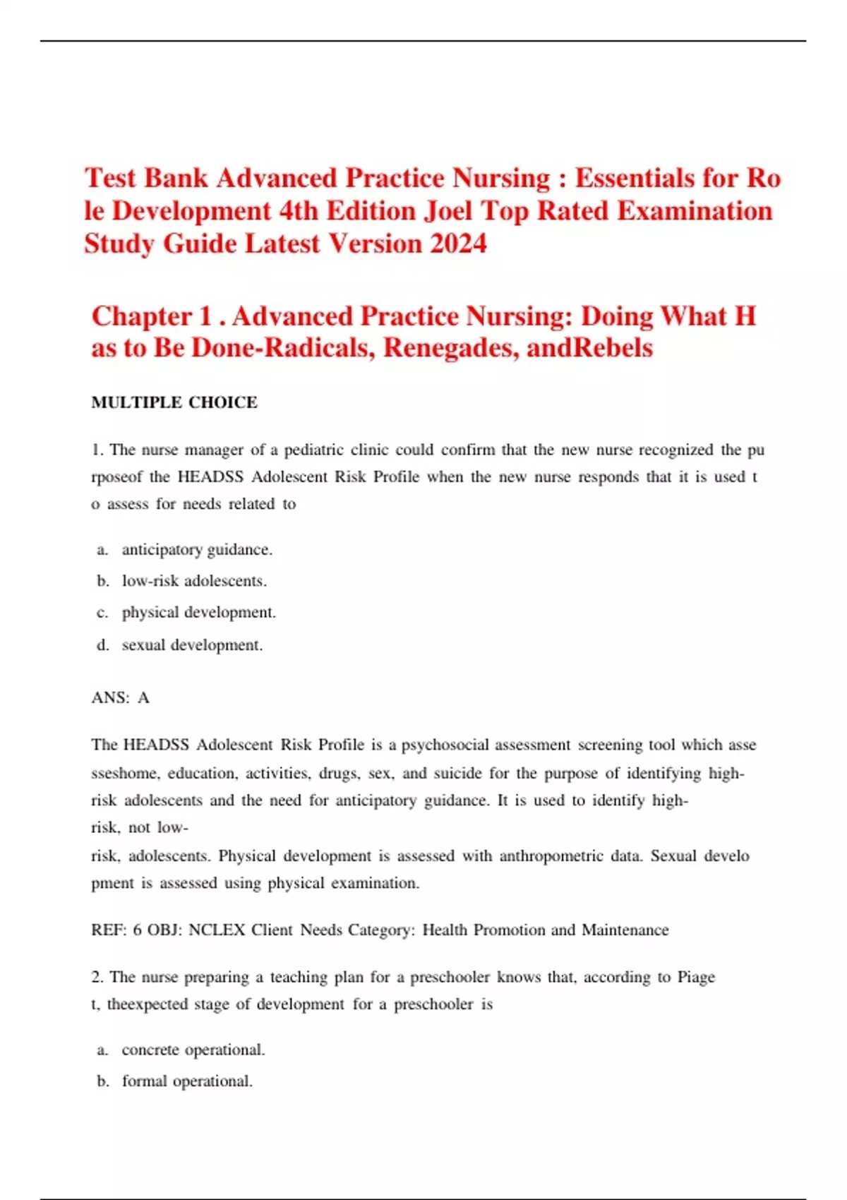 , Test Bank Advanced Practice Nursing : Essentials for Rol