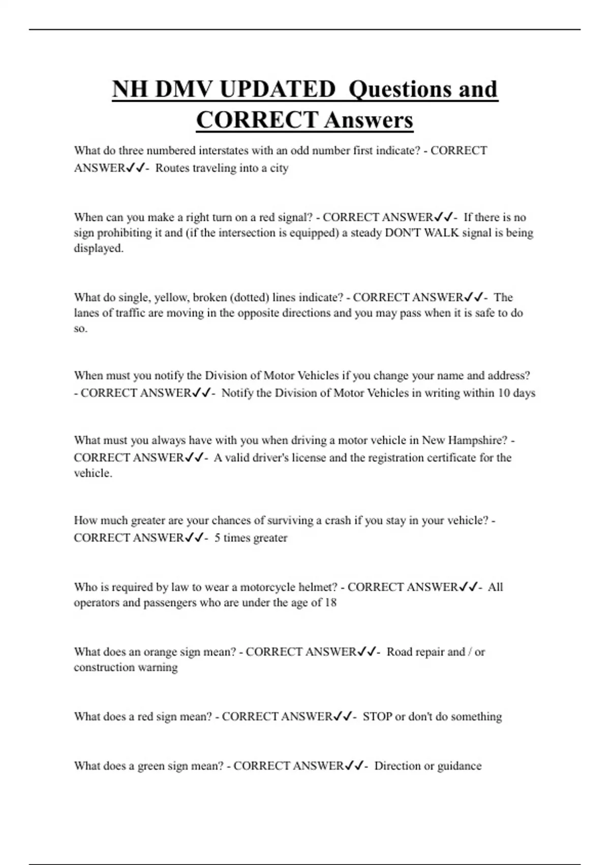 NH DMV UPDATED Questions and CORRECT Answers What do three numbered interstates with an odd number first indicate? - CORRECT ANSWER- Routes traveling into a city When can you make a right turn on a red signal? - CORRECT ANSWER- If there is no sign prohibiting it and (if the intersection is equipped) a steady DON'T WALK signal is being displayed