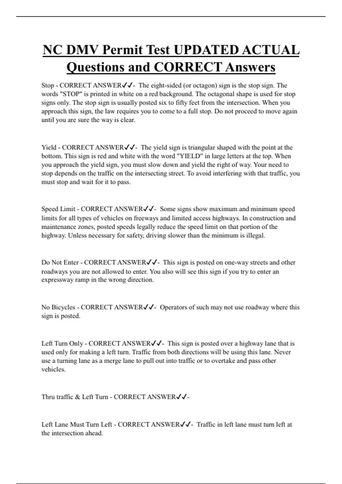 NC DMV Permit Test UPDATED ACTUAL Questions and CORRECT Answers Stop - CORRECT ANSWER- The eight-sided (or octagon) sign is the stop sign. The words "STOP" is printed in white on a red background. The octagonal shape is used for stop signs only. The stop sign is usually posted six to fifty feet from the intersection. When you approach this sign, the law requires you to come to a full stop. Do not proceed to move again until you are sure the way is clear.