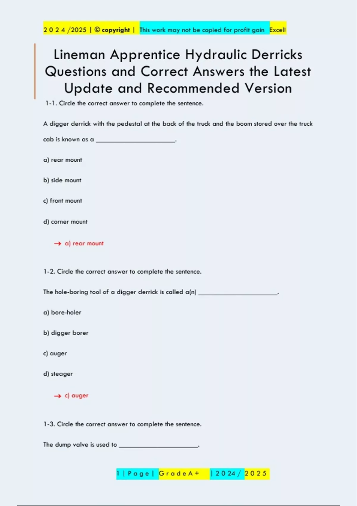 Circle the correct answer to complete the sentence. A digger derrick with the pedestal at the back of the truck and the boom stored over the truck cab is known as a ______________________. a) rear mount b) side mount c) front mount d) corner mount → a) rear mount 1-2. Circle the correct answer to complete the sentence. The hole-boring tool of a digger derrick is called a(n) ______________________. a) bore-holer b) digger borer c) auger d) steager → c) auger 1-3. Circle the correct answer to complete the sentence. The dump valve is used to ______________________. 2 0 2 4 /2025 | © copyright | This work may not be copied for profit gain Excel! 1 | P a g e | G r a d e A + | 2 0 24 / 2 0 2 5 a) dump the valve if it gets stuck b) temporarily stop the hydraulic system c) store the auger d) raise the outriggers → b) temporarily stop the hydraulic system 1-4. Circle the correct answer to complete the sentence. The term hook radius refers to the distance from ______________________. a) pedestal to front bumper b) rear of truck to