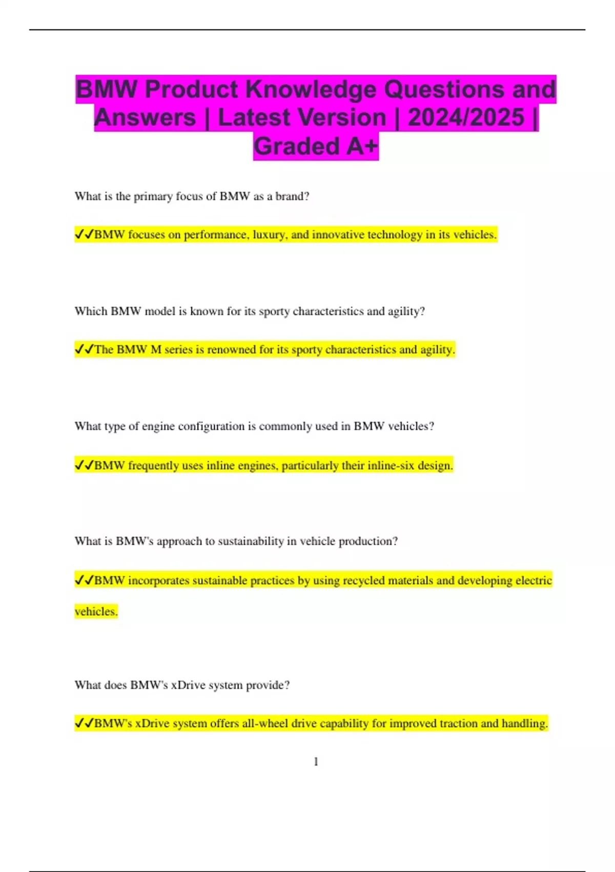 BMW Product Knowledge Questions and Answers | Latest Version | 2024/2025 | Graded A+ What is the primary focus of BMW as a brand? BMW focuses on performance, luxury, and innovative technology in its vehicles. Which BMW model is known for its sporty characteristics and agility? The BMW M series is renowned for its sporty characteristics and agility. What type of engine configuration is commonly used in BMW vehicles? BMW frequently uses inline engines, particularly their inline-six design. What is BMW's approach to sustainability in vehicle production? BMW incorporates sustainable practices by using recycled materials and developing electric vehicles. What does BMW's xDrive system provide? BMW's xDrive system offers all-wheel drive capability for improved traction and handling. 2 What is the function of the BMW iDrive system? The iDrive system is designed to control navigation, entertainment, and communication functions in BMW vehicles. Which BMW model is recognized as a luxury SUV? The BMW X5 is recognized as a luxury SUV within the BMW lineup. What is unique about the design of BMW’s kidney grille? The kidney grille is a signature design element of BMW, symbolizing the brand’s heritage and identity. What technology does BMW use to enhance driving dynamics? BMW employs technologies like Dynamic Stability Control (DSC) and Adaptive Suspension to enhance driving dynamics. What is the purpose of the BMW ConnectedDrive feature? ConnectedDrive provides in-car connectivity and access to a variety of digital services and apps. 3 How does BMW ensure vehicle safety? BMW ensures safety through advanced driver-assistance systems and structural integrity in vehicle design. What is the significance of the BMW "Ultimate Driving Machine" slogan? This slogan emphasizes BMW's commitment to delivering an exhilarating driving experience. Which type of vehicle does the BMW i series represent? The BMW i series represents the