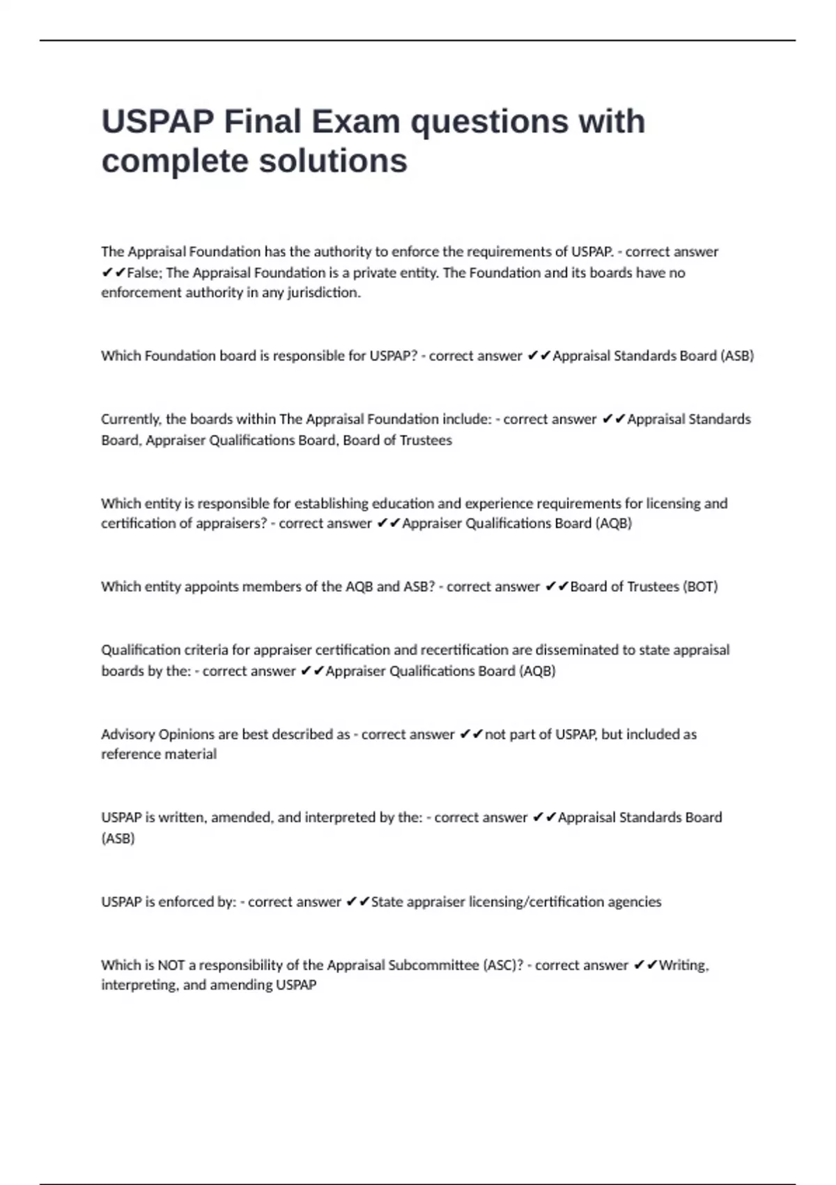 Which Foundation board is responsible for USPAP? - correct answer ✔✔Appraisal Standards Board (ASB)