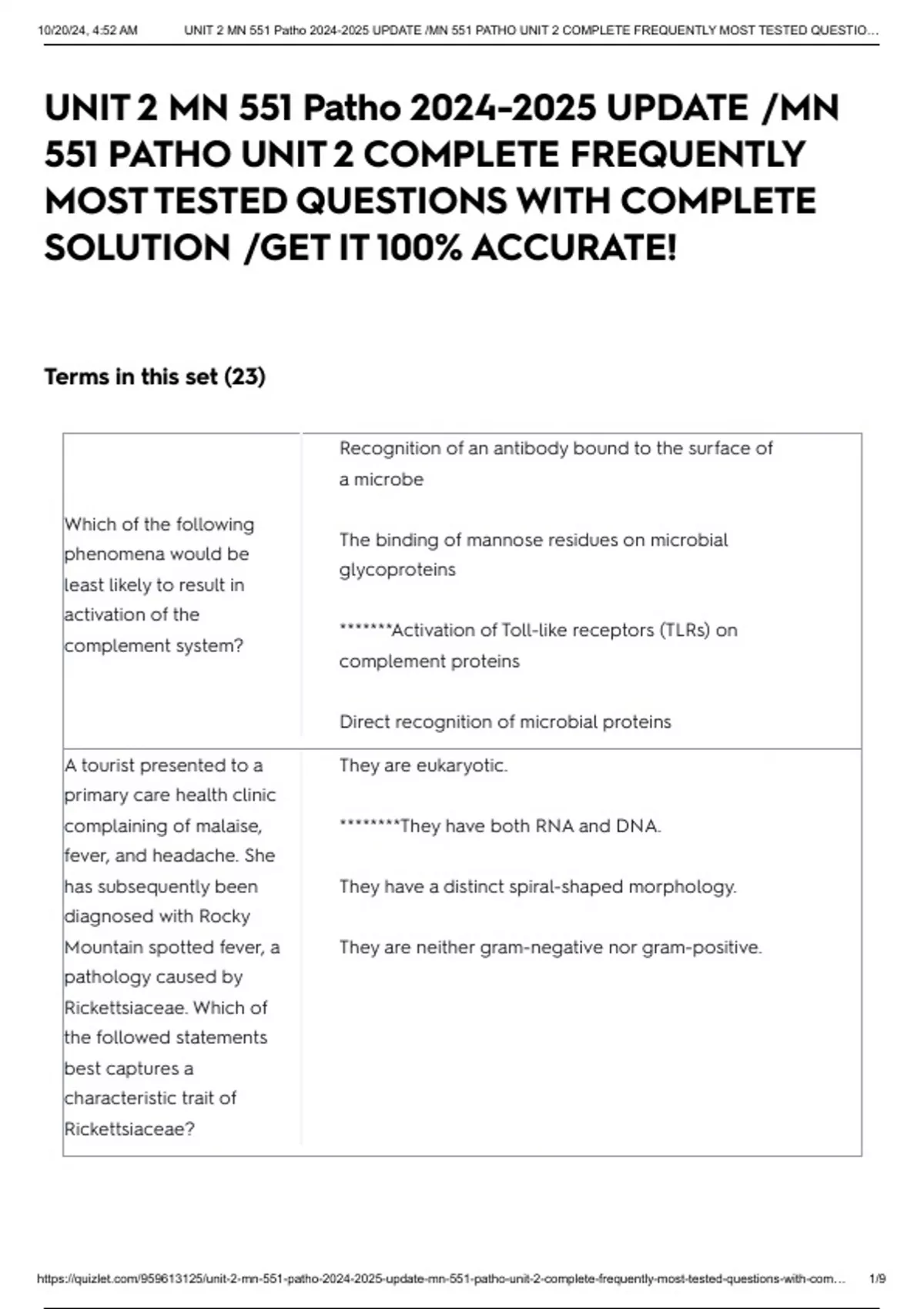 , 10/20/24, 4:52 AM UNIT 2 MN 551 Patho 2024-2025 UPDATE /MN 551 PATHO UNIT 2 COMPLETE FREQUENTLY MOST TESTED QUESTIO…
