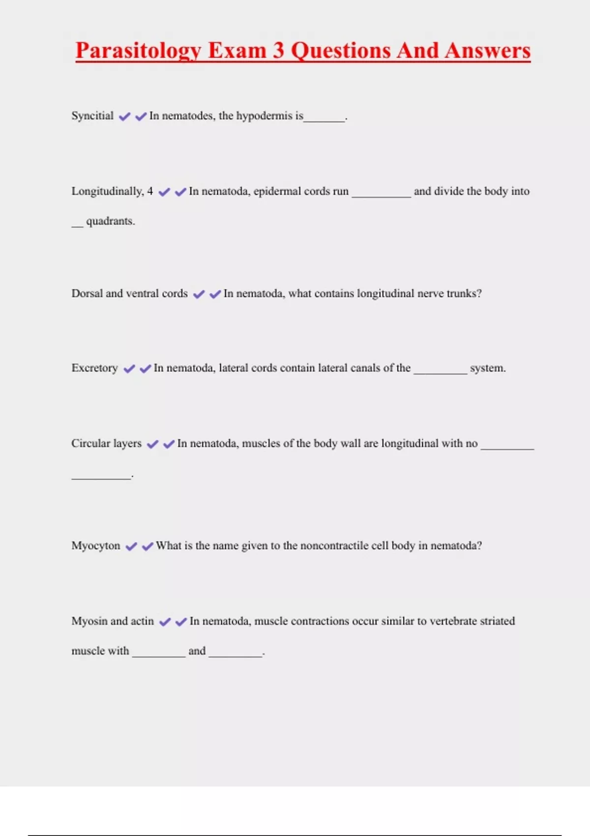 Parasitology Exam 3 Questions And Answers Syncitial In nematodes, the hypodermis is_______. Longitudinally, 4 In nematoda, epidermal cords run __________ and divide the body into __ quadrants. Dorsal and ventral cords In nematoda, what contains longitudinal nerve trunks? Excretory In nematoda, lateral cords contain lateral canals of the _________ system. Circular layers In nematoda, muscles of the body wall are longitudinal with no _________ __________. Myocyton What is the name given to the noncontractile cell body in nematoda?