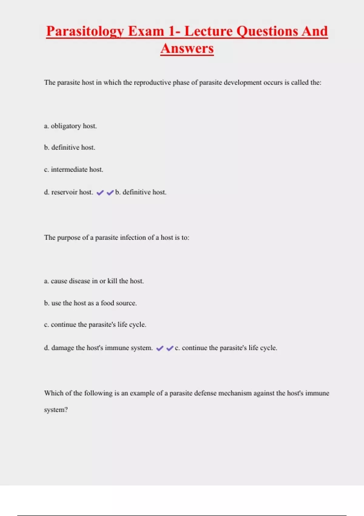 Parasitology Exam 1- Lecture Questions And Answers The parasite host in which the reproductive phase of parasite development occurs is called the: a. obligatory host. b. definitive host. c. intermediate host. d. reservoir host. b. definitive host.