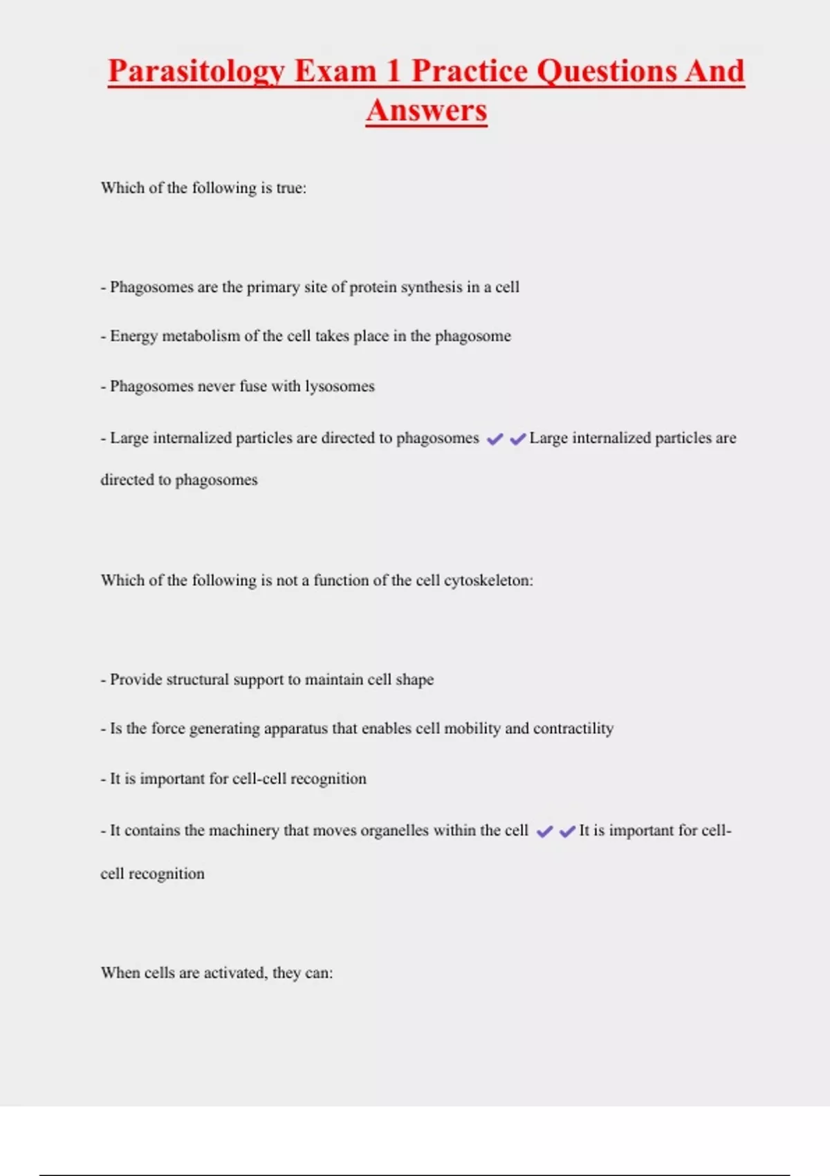 Parasitology Exam 1 Practice Questions And Answers Which of the following is true: - Phagosomes are the primary site of protein synthesis in a cell - Energy metabolism of the cell takes place in the phagosome - Phagosomes never fuse with lysosomes - Large internalized particles are directed to phagosomes Large internalized particles are directed to phagosomes