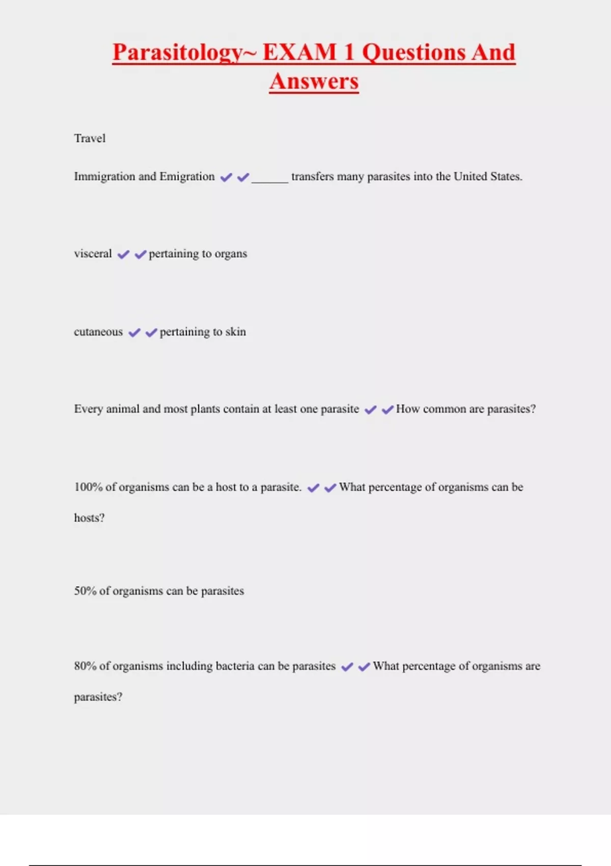 Parasitology~ EXAM 1 Questions And Answers Travel Immigration and Emigration ______ transfers many parasites into the United States. visceral pertaining to organs cutaneous pertaining to skin Every animal and most plants contain at least one parasite How common are parasites? 100% of organisms can be a host to a parasite. What percentage of organisms can be hosts?