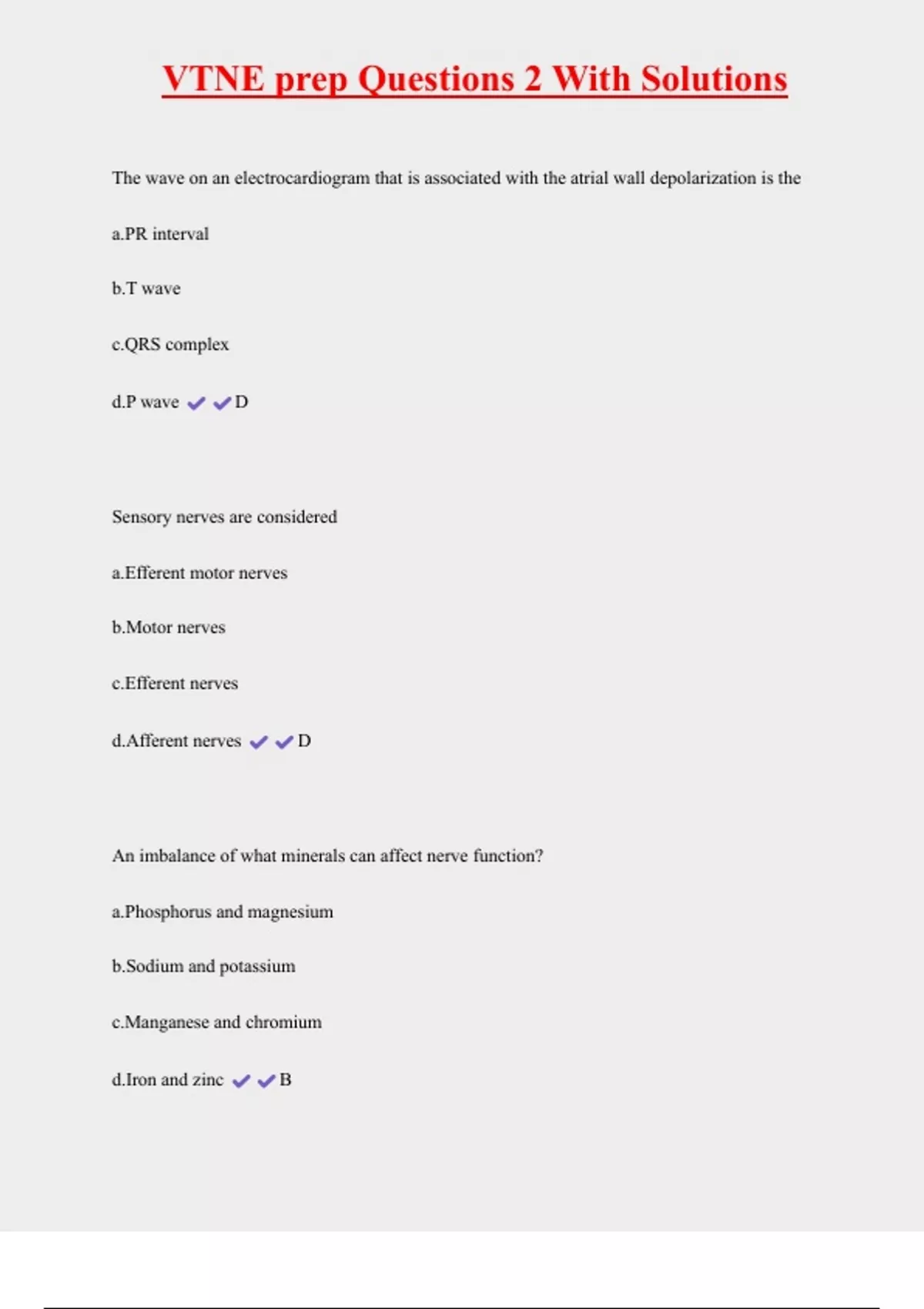 VTNE prep Questions 2 With Solutions The wave on an electrocardiogram that is associated with the atrial wall depolarization is the a.PR interval b.T wave c.QRS complex d.P wave D Sensory nerves are considered a.Efferent motor nerves b.Motor nerves c.Efferent nerves d.Afferent nerves D