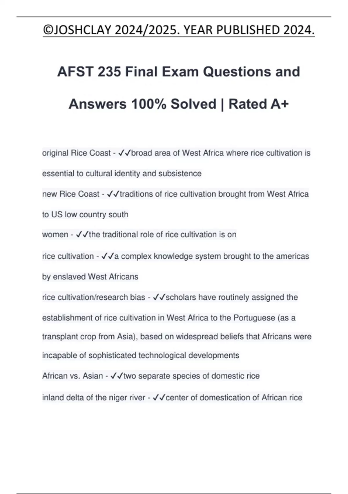 AFST 235 Final Exam Questions and