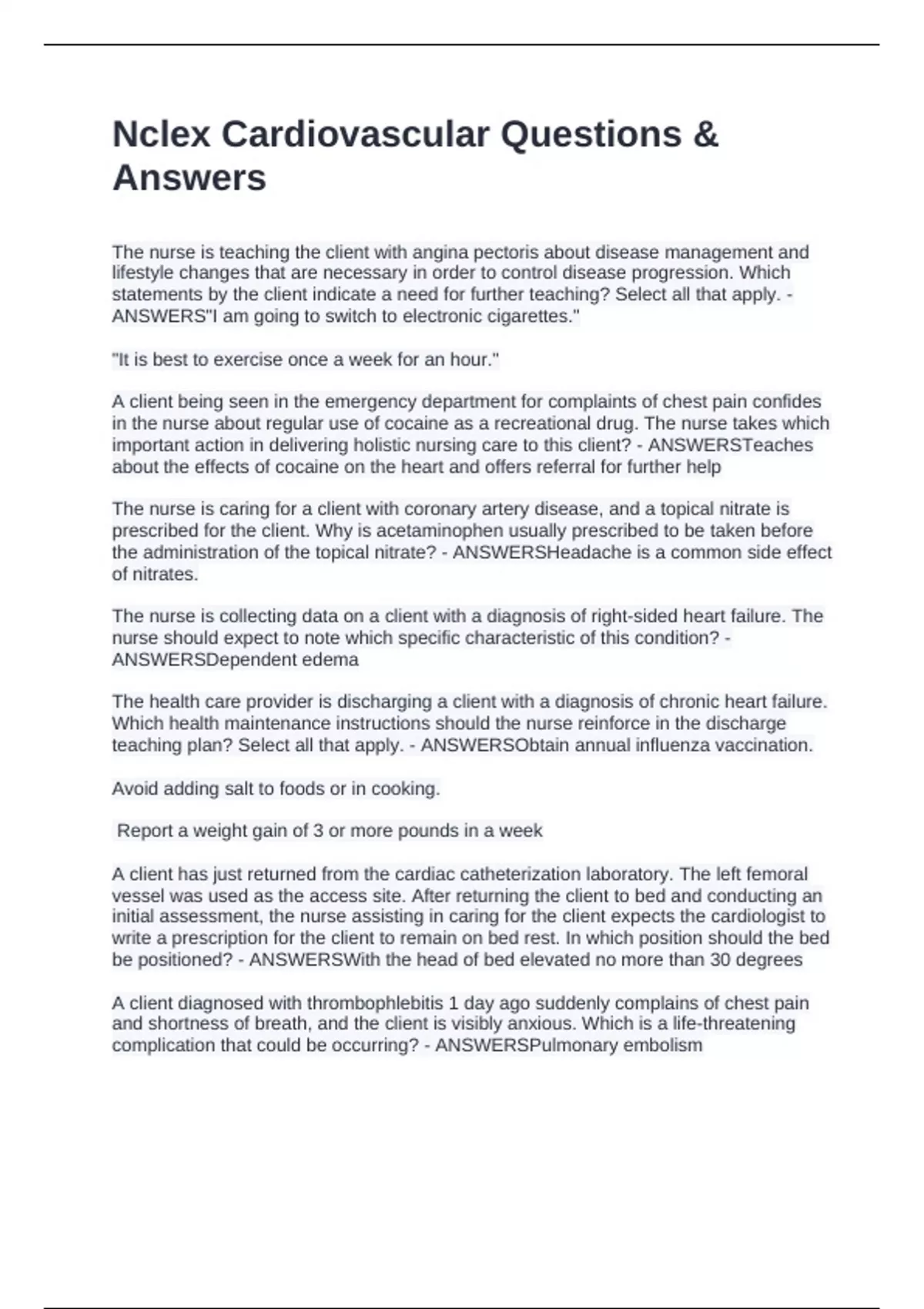 the client? - ANSWERSSupine with the head of bed elevated at a 45- to 60-degree