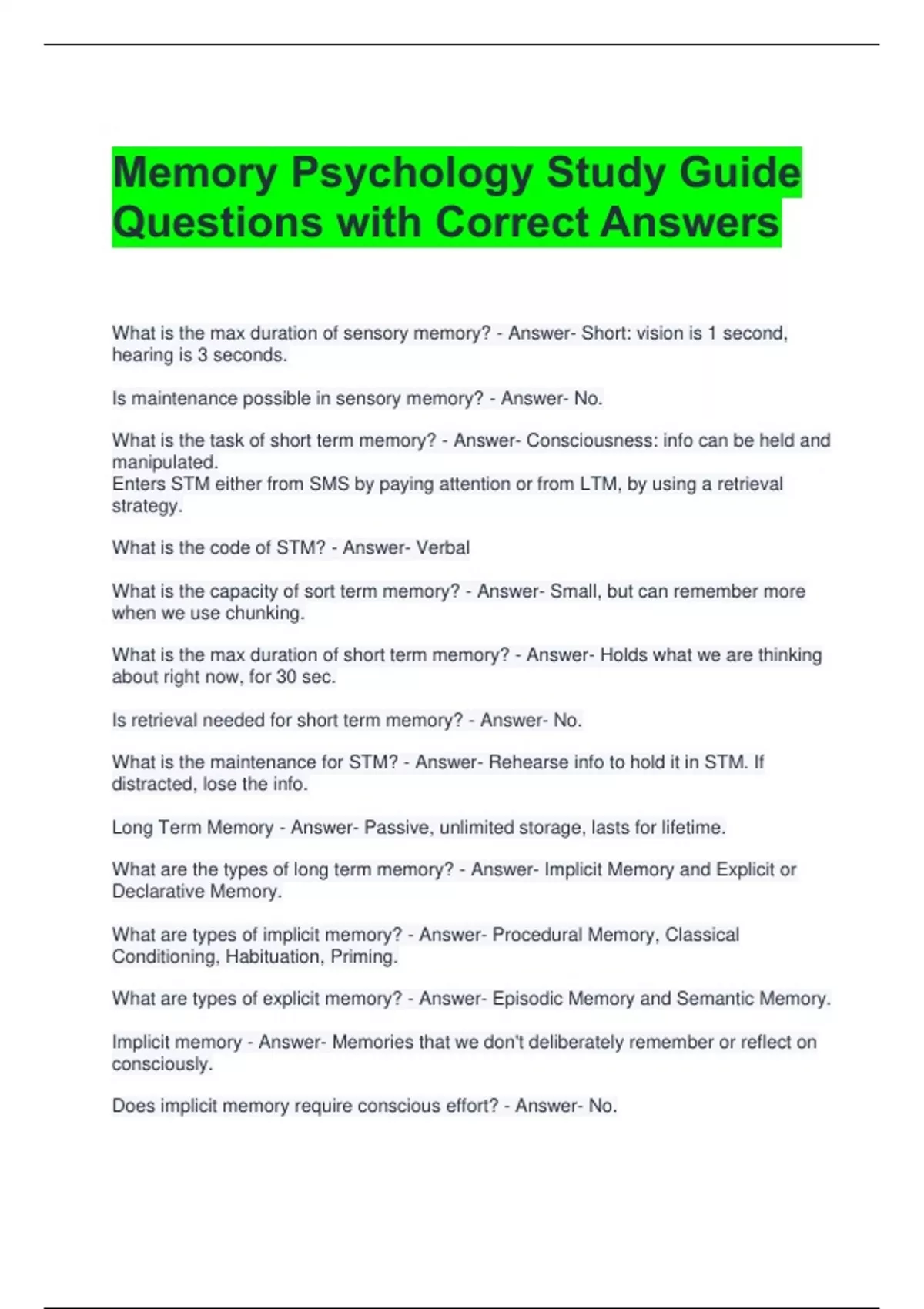 Memory Psychology Study Guide Questions with Correct Answers What is the max duration of sensory memory? - Answer- Short: vision is 1 second, hearing is 3 seconds. Is maintenance possible in sensory memory? - Answer- No. What is the task of short term memory? - Answer- Consciousness: info can be held and manipulated. Enters STM either from SMS by paying attention or from LTM, by using a retrieval strategy. What is the code of STM? - Answer- Verbal What is the capacity of sort term memory? - Answer- Small, but can remember more when we use chunking. What is the max duration of short term memory? - Answer- Holds what we are thinking about right now, for 30 sec. Is retrieval needed for short term memory? - Answer- No. What is the maintenance for STM? - Answer- Rehearse info to hold it in STM. If distracted, lose the info. Long Term Memory - Answer- Passive, unlimited storage, lasts for lifetime. What are the types of long term memory? - Answer- Implicit Memory and Explicit or Declarative Memory. What are types of implicit memory? - Answer- Procedural Memory, Classical Conditioning, Habituation, Priming. What are types of explicit memory? - Answer- Episodic Memory and Semantic Memory.