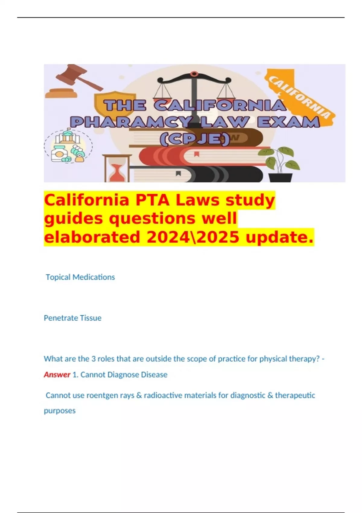 California PTA Laws study guides questions well elaborated update. Topical Medications Penetrate Tissue What are the 3 roles that are outside the scope of practice for physical therapy? - Answer 1. Cannot Diagnose Disease Cannot use roentgen rays & radioactive materials for diagnostic & therapeutic purposes Cannot use of electricity for surgical purposes, including cauterization What are the 4 conditions for Tissue Penetration for physical therapy? - Answer 1. Authorized by Physician & Surgeon (Prescription) PT Certified by the Board Adopt Standards & Procedures of the Board Cannot make Diagnosis or Prognosis of the data Documentation