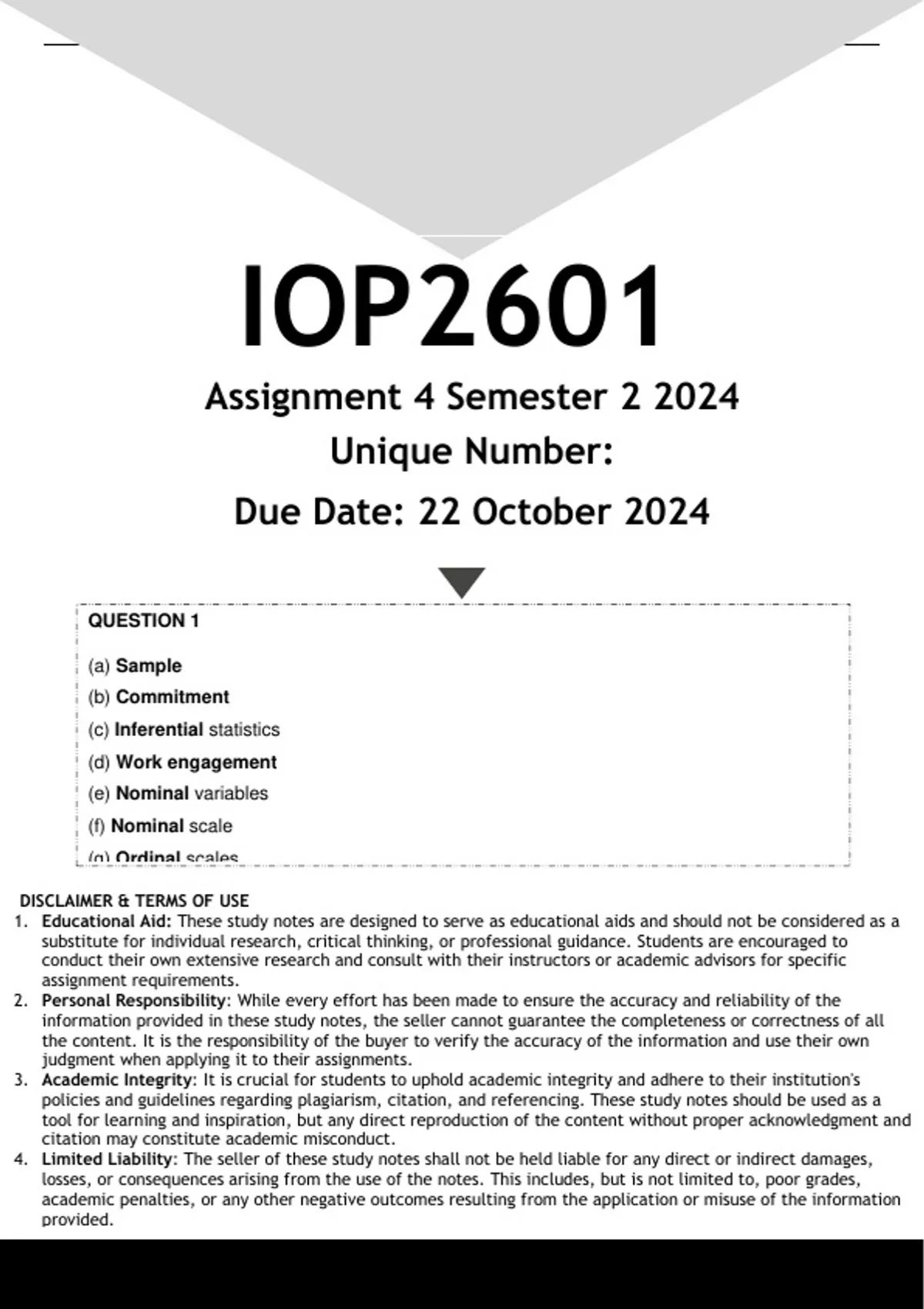 Well-structured IOP2601 Assignment 4 (ANSWERS) Semester 2 2024 - DISTINCTION GUARANTEED. (DETAILED ANSWERS - DISTINCTION GUARANTEED!).....QUESTION 1 [8] You have recently been appointed as a research assistant at UNISA, working alongside a distinguished professor in the College of Economic and Management Sciences (CEMS). Together, you are embarking on an exciting study involving a group of 500 postgraduate research students. The focus of the study is to explore whether there are differences in the levels of commitment to research between male and female postgraduate students. (a) If you were to select 250 of the 500 postgraduate students for this research study, those selected would be your _______. (1) (b) The study examines two variables: gender and commitment. What is the dependent variable in the professor’s study? (1) (c) This type of research would be classified as ______ statistics. (1) (d) In the research article “S. W. Mvana (2023). Teacher Retention: Work Engagement, Psychological Capital, and Human Resource Retention Practices Satisfaction in South Africa. Annals of the University of Craiova for Journalism, Communication and Management, 9, 93-105,” Mvana hypothesised that work engagement is positively linked to satisfaction with human resource retention practices. What is the independent variable in this hypothesis? (1) (e) ______ variables indicate that there is a difference between categories of objects, persons or characteristics. (1) (f) Which scale of measurement uses numbers as labels that distinguish categories? (1) (g) ______ scales of measurement indicate categories that are not only different from one another, but also different in terms of rank or order. (1) (h) When participants’ opinions are labelled as strongly agree, agree, disagree, and strongly disagree, the labels are measured on ______ scales. (1) [TURN OVER] 2 IOP2601_Assignment 4_Semester 2_2024 QUESTION 2 [20] As a newly appointed research assistant at UNISA, you aim to explore the relationship between student participation in online discussions and their final examination scores. You have received a detailed report containing the participation metrics of students in online forums, alongside their final examination scores. Both metrics have been rated on a scale of 1 to 10, with 1 representing minimal participation or the lowest exam score, and 10 indicating maximum participation or the highest exam score. Your objective is to analyse whether higher levels of participation in online discussions (X) correlate with improved performance in final exams (Y). You did the summation calculations, and the answers are presented in the table below. Table 1 Students’ Data Set Σ