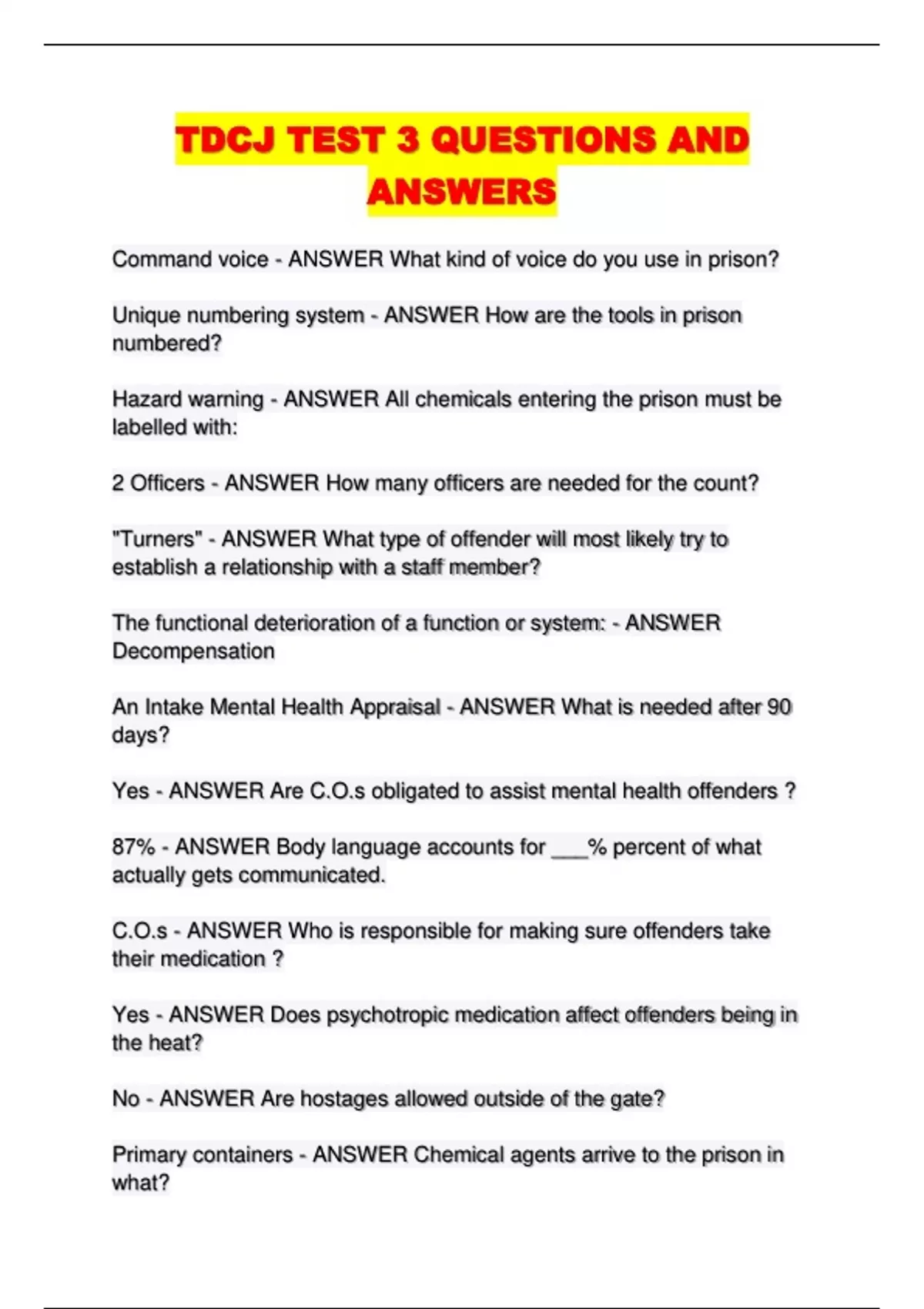 TDCJ TEST 3 QUESTIONS AND ANSWERS...