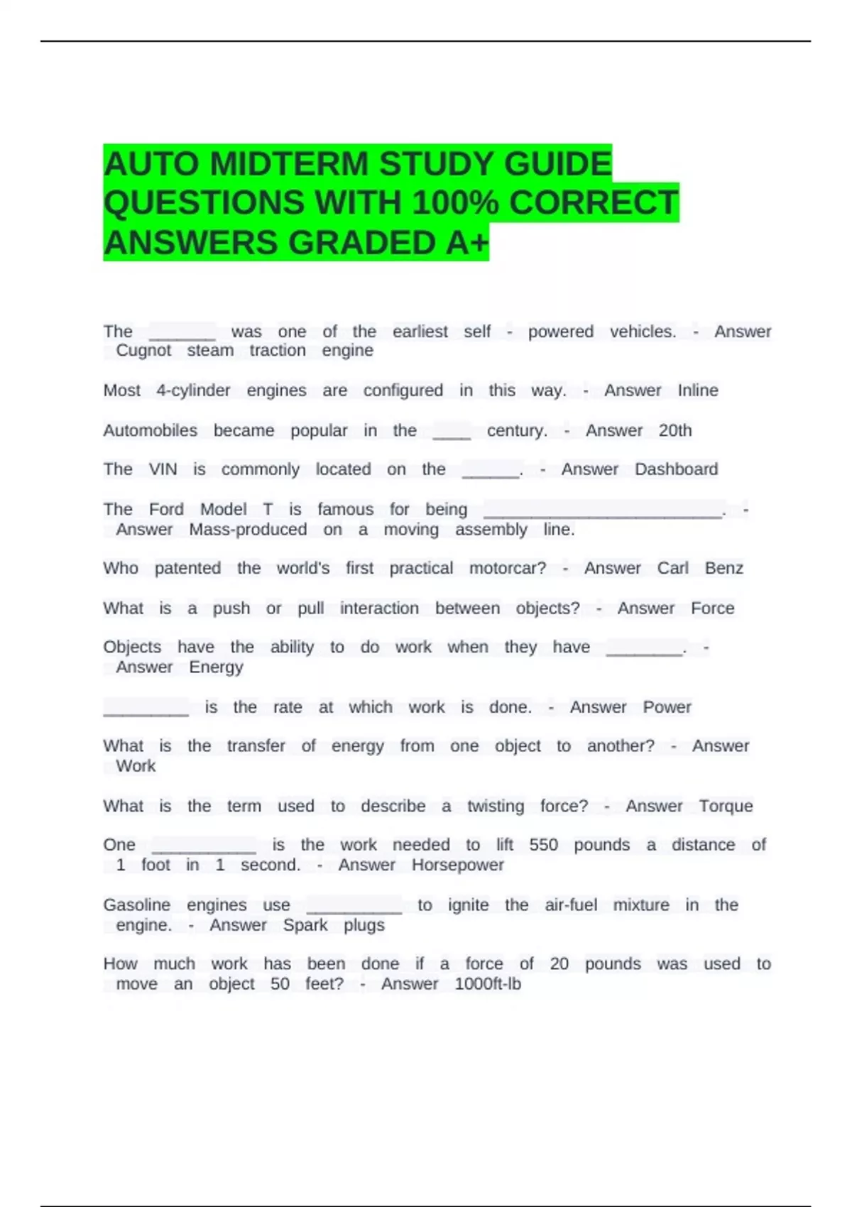 AUTO MIDTERM STUDY GUIDE QUESTIONS WITH 100% CORRECT ANSWERS GRADED A+