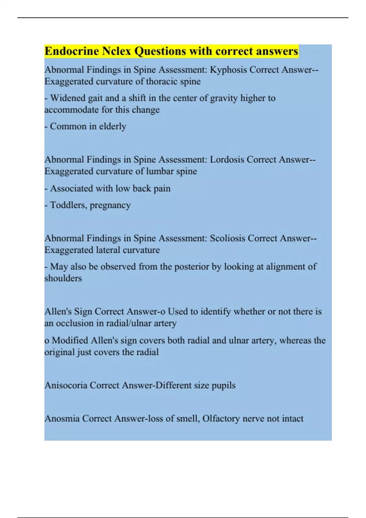 Abnormal Findings in Spine Assessment: Lordosis Correct Answer--