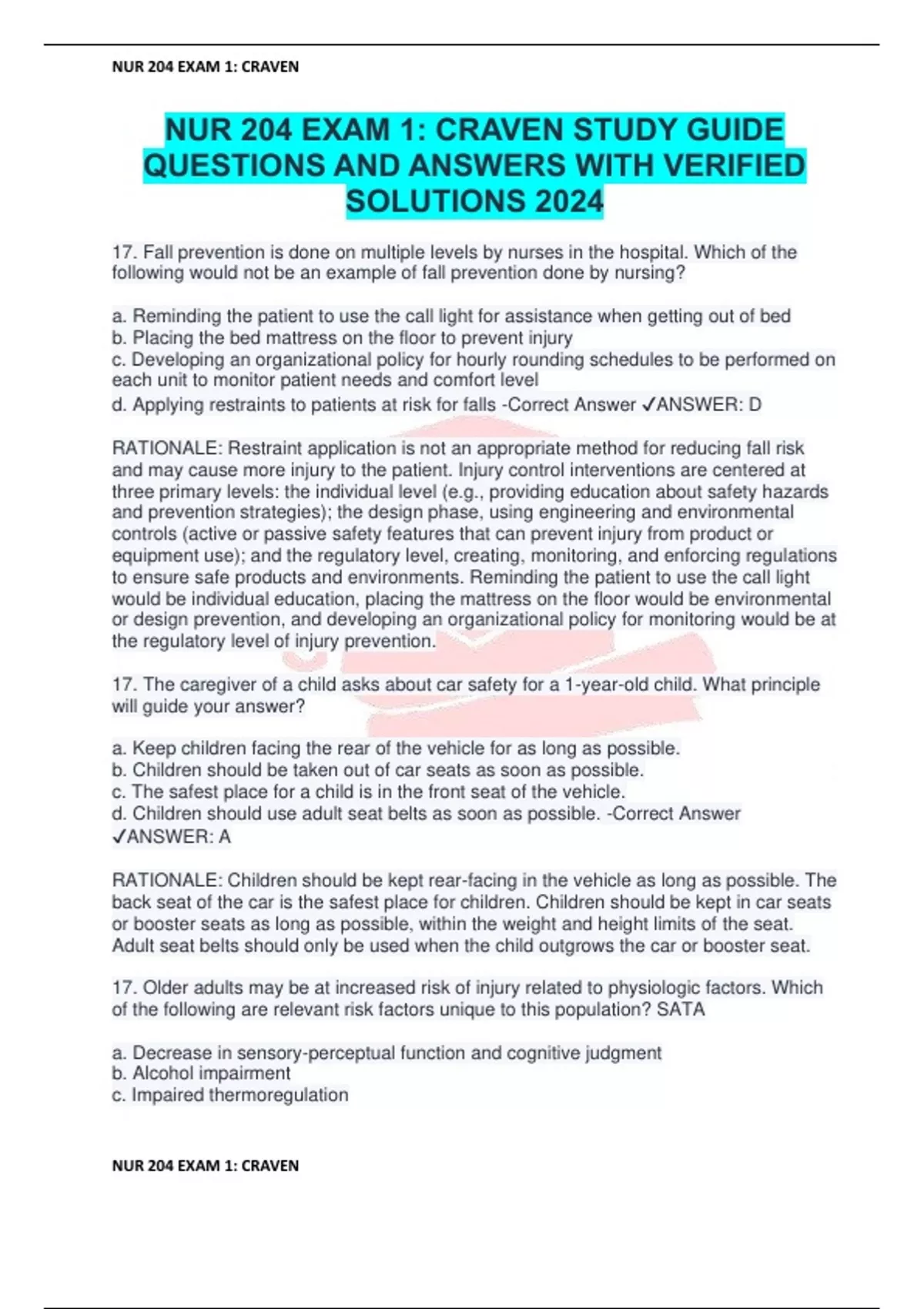 17. Fall prevention is done on multiple levels by nurses in the hospital. Which of the following would not be an example of fall prevention done by nursing? a. Reminding the patient to use the call light for assistance when getting out of bed b. Placing the bed mattress on the floor to prevent injury c. Developing an organizational policy for hourly rounding schedules to be performed on each unit to monitor patient needs and comfort level d. Applying restraints to patients at risk for falls -Correct Answer ANSWER: D RATIONALE: Restraint application is not an appropriate method for reducing fall risk and may cause more injury to the patient. Injury control interventions are centered at three primary levels: the individual level (e.g., providing education about safety hazards and prevention strategies); the design phase, using engineering and environmental controls (active or passive safety features that can prevent injury from product or equipment use); and the regulatory level, creating, monitoring, and enforcing regulations to ensure safe products and environments. Reminding the patient to use the call light would be individual education, placing the mattress on the floor would be environmental or design prevention, and developing an organizational policy for monitoring would be at the regulatory level of injury prevention. 17. The caregiver of a child asks about car safety for a 1-year-old child. What principle will guide your answer? a. Keep children facing the rear of the vehicle for as long as possible. b. Children should be taken out of car seats as soon as possible. c. The safest place for a child is in the front seat of the vehicle. d. Children should use adult seat belts as soon as possible. -Correct Answer ANSWER: A RATIONALE: Children should be kept rear-facing in the vehicle as long as possible. The back seat of the car is the safest place for children. Children should be kept in car seats or booster seats as long as possible, within the weight and height limits of the seat. Adult seat belts should only be used when the child outgrows the car or booster seat. 17. Older adults may be at increased risk of injury related to physiologic factors. Which of the following are relevant risk factors unique to this population? SATA a. Decrease in sensory-perceptual function and cognitive judgment b. Alcohol impairment c. Impaired thermoregulation d. Medication side effects e. Development of osteoporosis -Correct Answer ANSWER: A,C, D RATIONALE: Advancing age entails loss in physical function and usually in acuity of sensory-perceptual function (e.g., impaired vision). Older adults may have impaired eyesight and hearing and decreased proprioception to maintain balance and sensitivity to touch. The ability to thermoregulate may become impaired; older adults are at higher risk than younger adults for hypothermia and heat stroke. Reflex responses slow, and the musculoskeletal system can lose flexibility and strength. Various conditions, such as osteoporosis, arthritis, or heart failure, can limit the ability to endure sustained physical activity. Medications taken to control conditions such as high blood pressure or Parkinson disease may result in orthostatic hypotension and increase the potential for falling. Alcohol impairment is not unique to older adults. 17. Nurses should be aware of various safety hazards in the workplace. Which of the following present safety hazards to nurses? SATA a. Cleaning solution spill b. Chemotherapy administration c. Needlestick injury d. Assisting with patient mobility or transfers e. Patient call systems -Correct Answer ANSWER: A, B, C, D RATIONALE: These safety hazards are relevant to nursing work environments. Other occupational hazards may include noise, hazardous dusts (e.g., asbestos, lead, coal) and chemicals, heights, dangerous machines, biologically infectious agents, and violence. Other dangers result when employers or workers do not follow safety precautions, such as wearing protective gear and following safe work practices. Patient call systems do not pose a risk to staff; in fact, they may alert staff to urgent needs that create safety hazards for patients. 17. An error occurs as the result of the lack of a double-check process on dosing of a high-risk opiate pain medication. The patient becomes oversedated, necessitating reversal of the opioids in order to regain a regular respiratory pattern. Which of the following should the nurse do to document the incident? SATA a. Describe factors that led up to the incident b. Document patient assessment findings following the error c. Chart in the patient's record the contributing factors d. Include interventions needed to reverse oversedation in incident report e. Document your personal dissatisfaction with the response from pharmacy about the incident -Correct Answer ANSWER: A, B, D