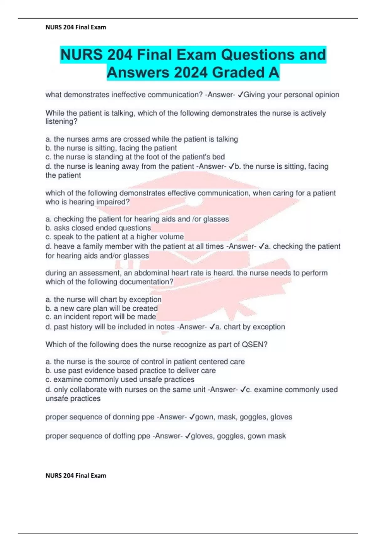 NURS 204 Final Exam Questions and