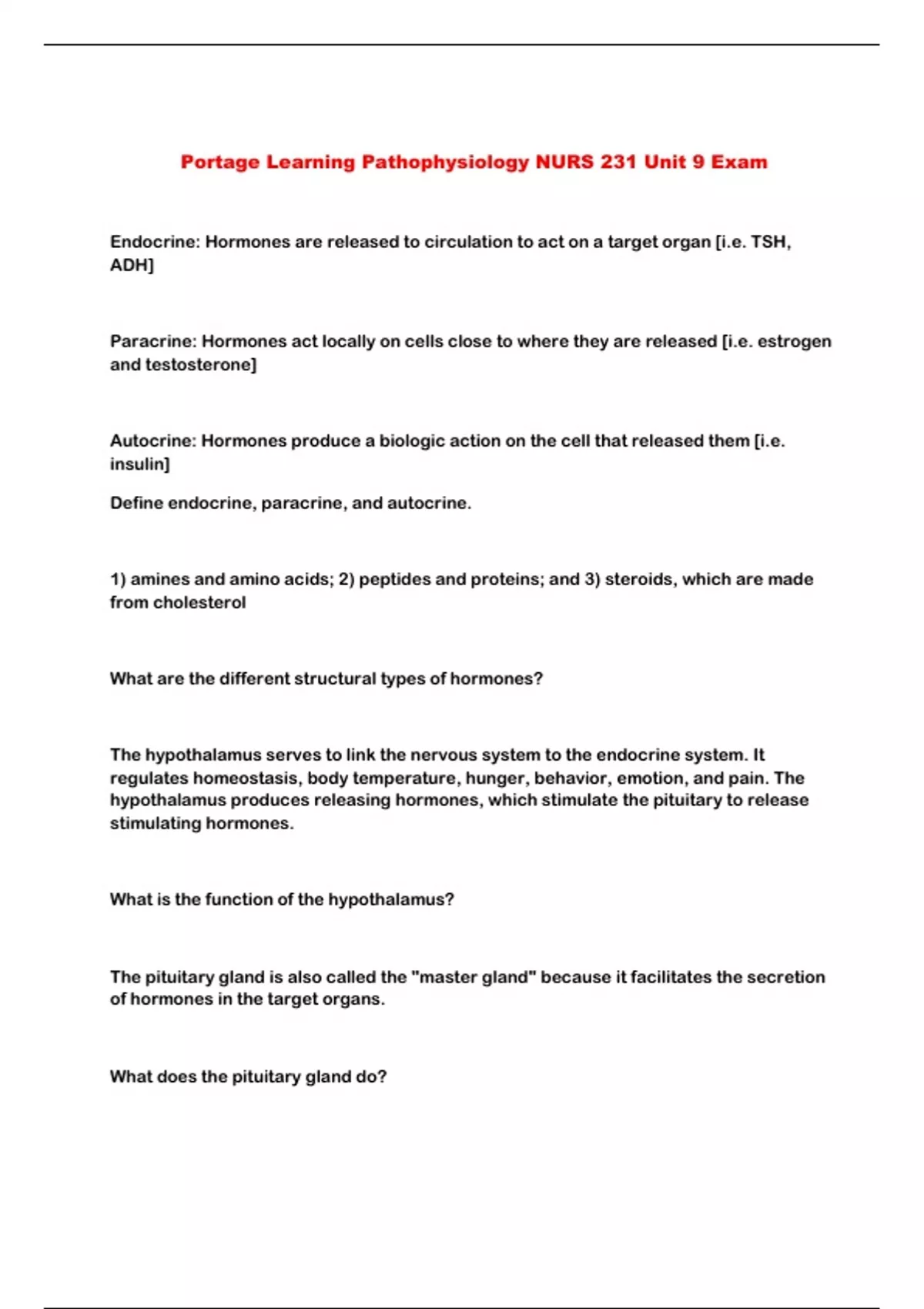Portage Learning Pathophysiology NURS 231 Unit 9 Exam